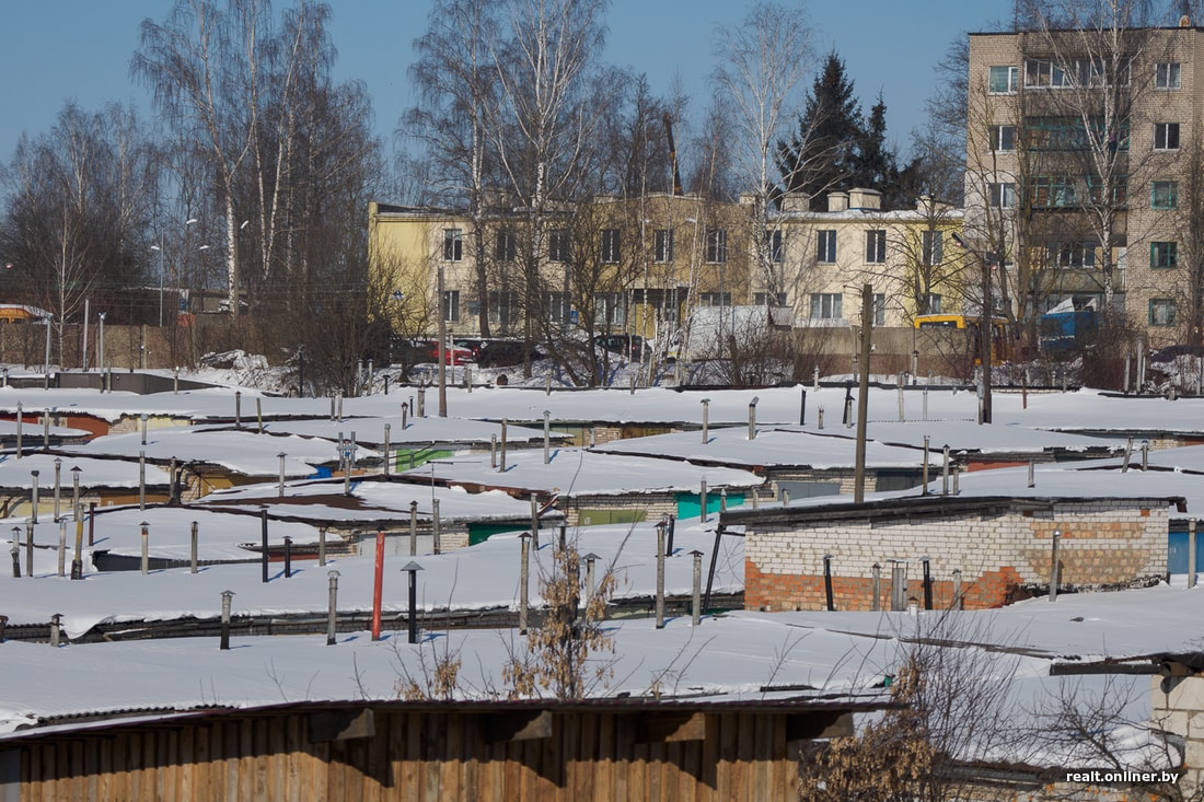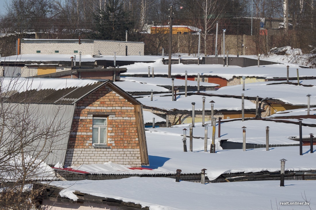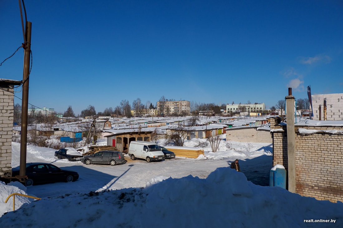 Гаражный кооператив в Мачулищах, судя по всему, создавался в девяностые: что-то построено из кирпича, что-то — из блоков, в подвалах можно найти двутавровые балки типичной для аэродрома (который находится неподалеку) расцветки. А в некоторых постройках ворота почему-то находятся на уровне второго этажа.