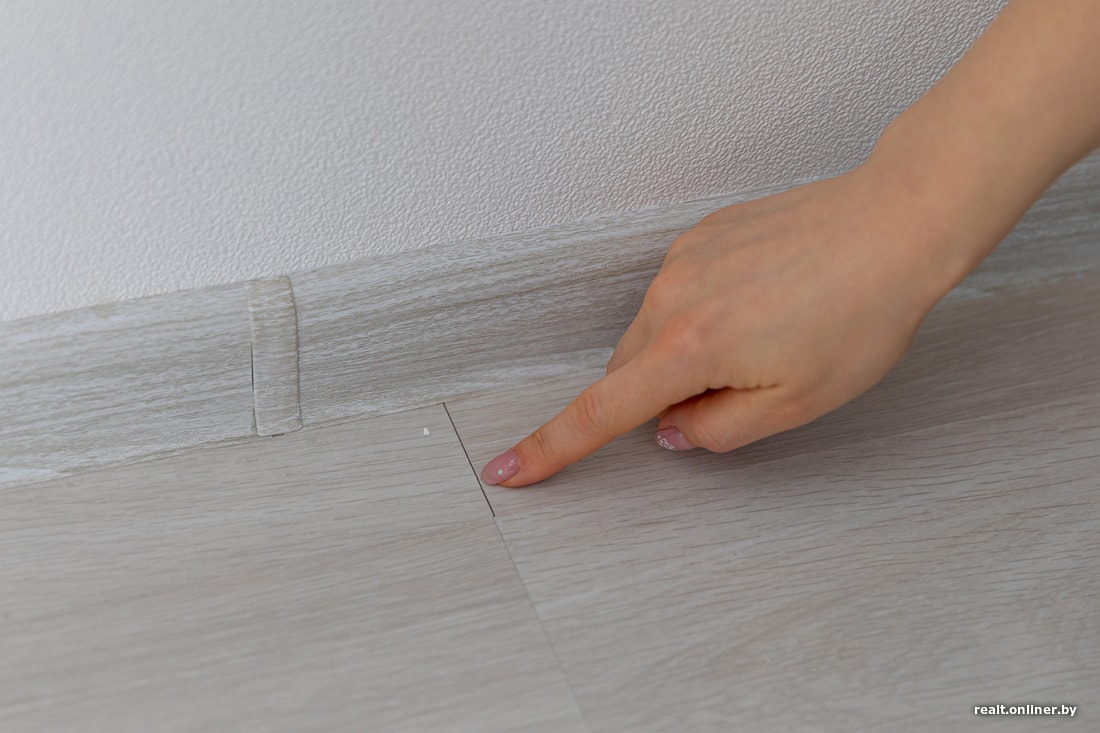 Даже если вы не специалист по приемке квартир, то проблемы с полом в новом доме наверняка бы заметили. Ламинат (кстати, довольно приятного цвета) во многих местах поднят домиком. Нежелательные треугольнички видны сразу, ощущаются, если прикоснуться рукой, и вообще оставляют крайне неприятное впечатление. Зачем сдавать жилье в таком виде, если понятно, что это надо переделывать?