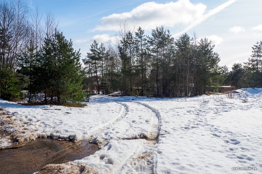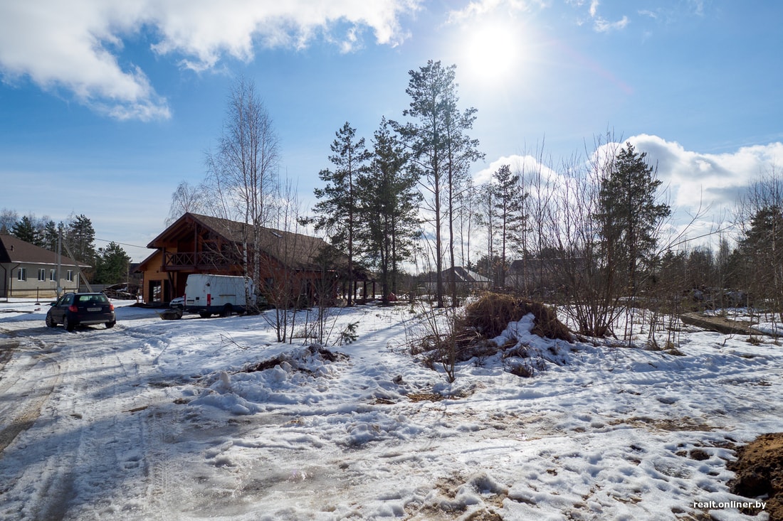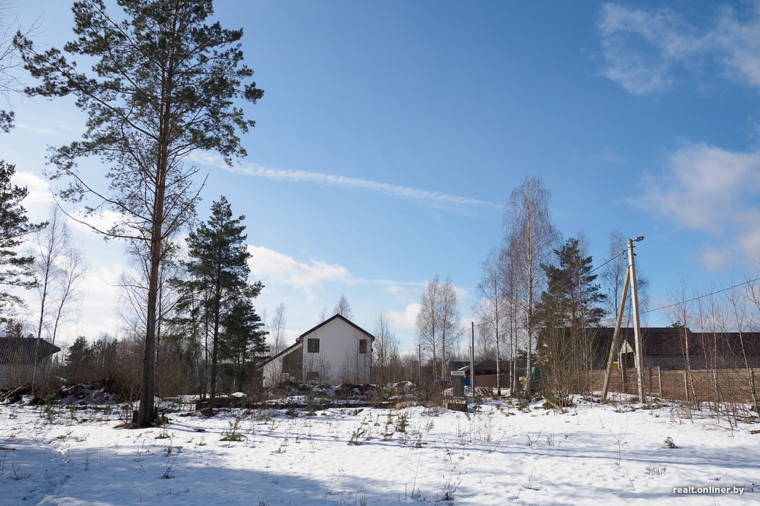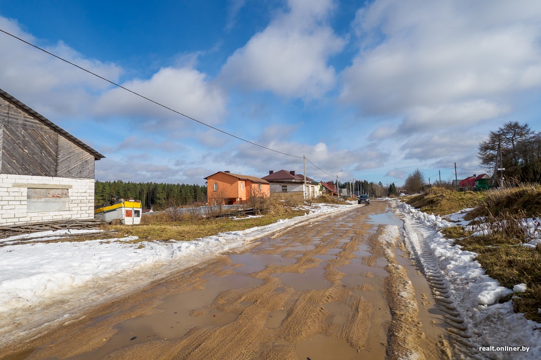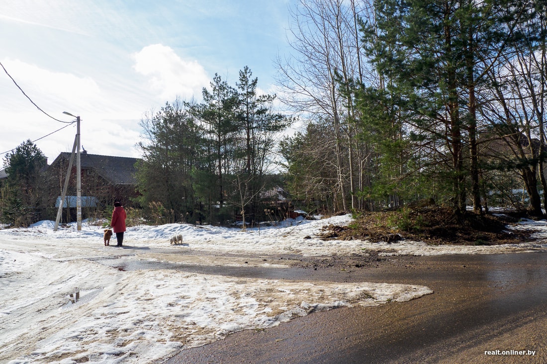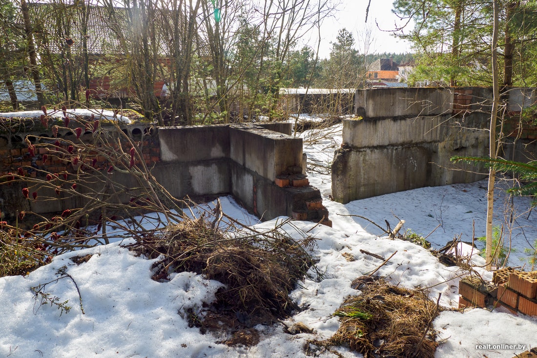 Первый лот — участок площадью 15,82 сотки в старой части Колодищей. Место неплохое — рядом добротные коттеджи, прямо к участку подходит асфальт, а через дорогу — лес. Из коммуникаций есть электричество и газ. От бывшего собственника остался старый блочный фундамент, площадь которого — 222 кв. м (придется потратиться на демонтаж).