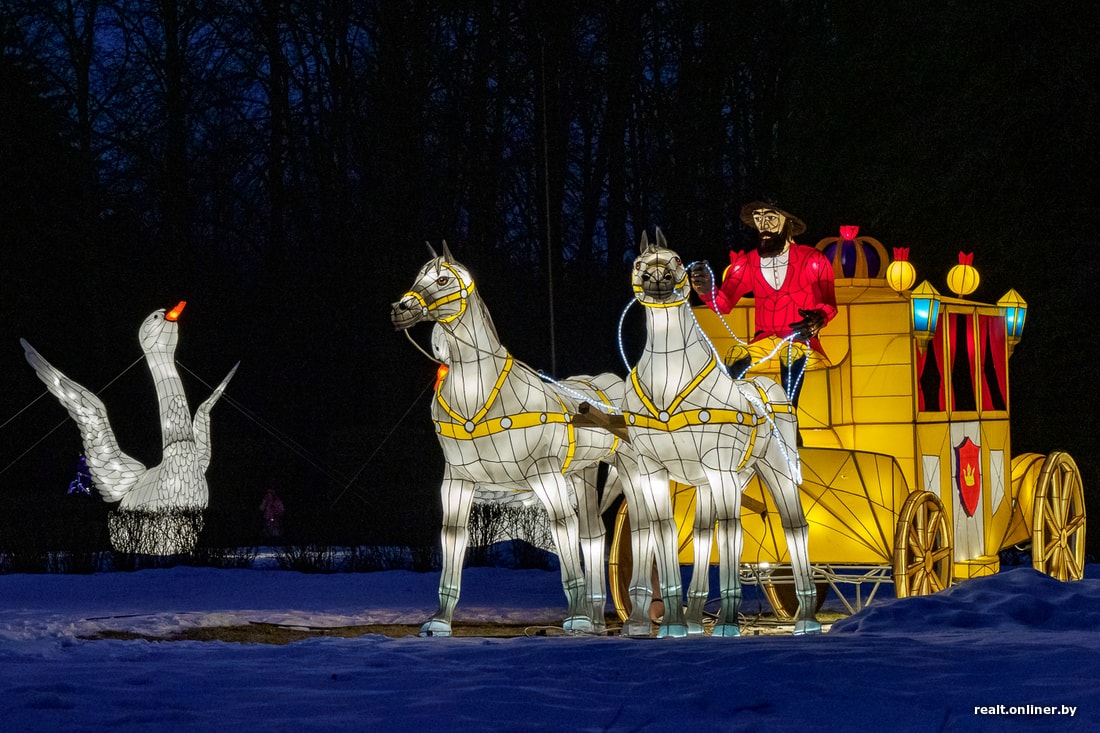 По словам организаторов, на оформление декораций ушли тысячи диодных лампочек, несколько километров светодиодной ленты, сотни метров атласной ткани. Высота самой большой фигуры — 6 метров, длина — еще около 10.