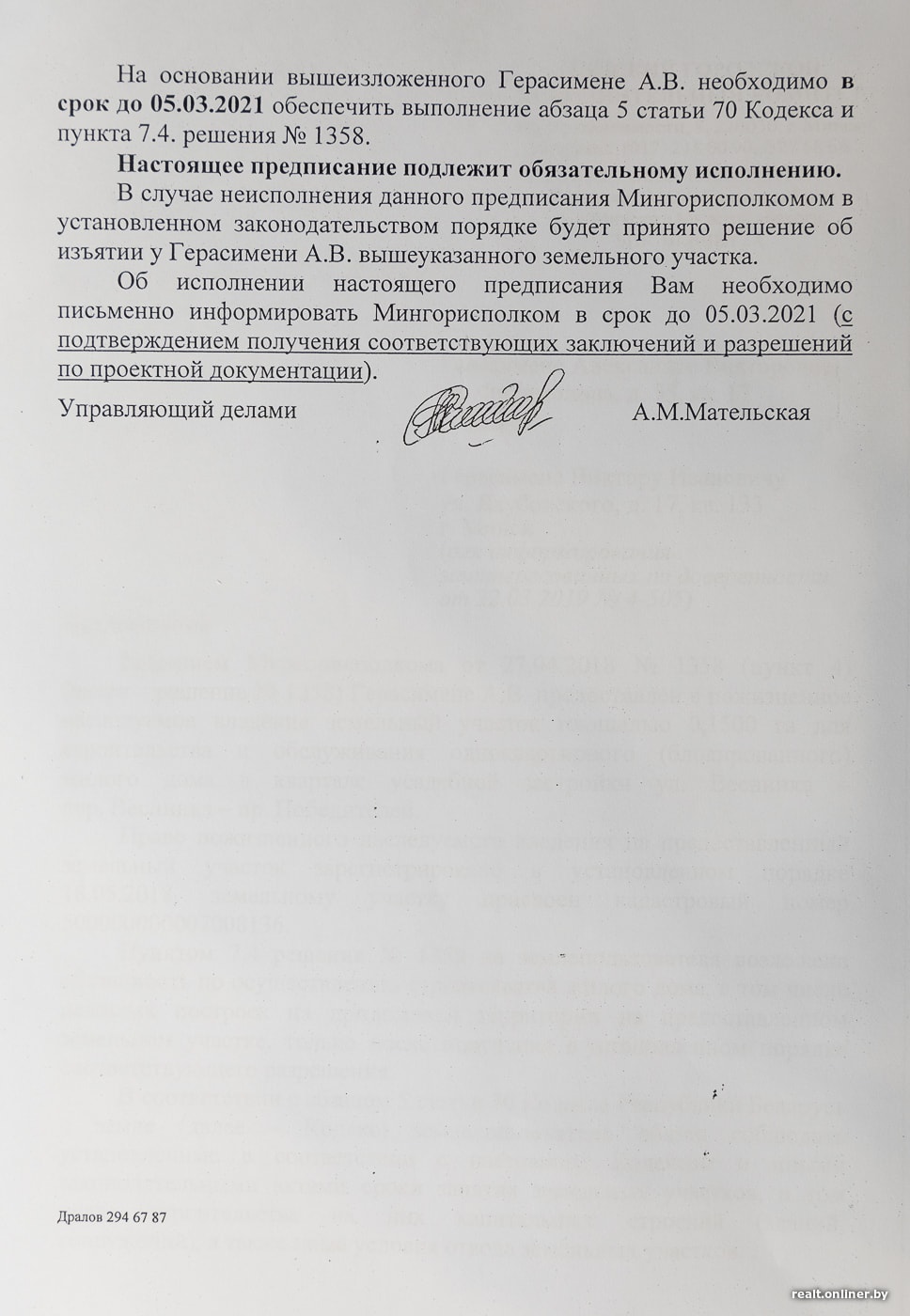 Мингорисполком, в свою очередь, предупредил, что минчанке необходимо в срок до 05.03.2021 разобраться-таки с проектной документацией и предоставить «Охрану окружающей среды», иначе участок будет изъят.