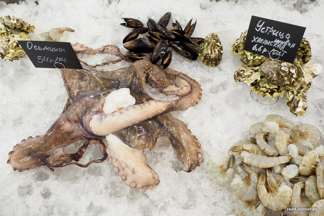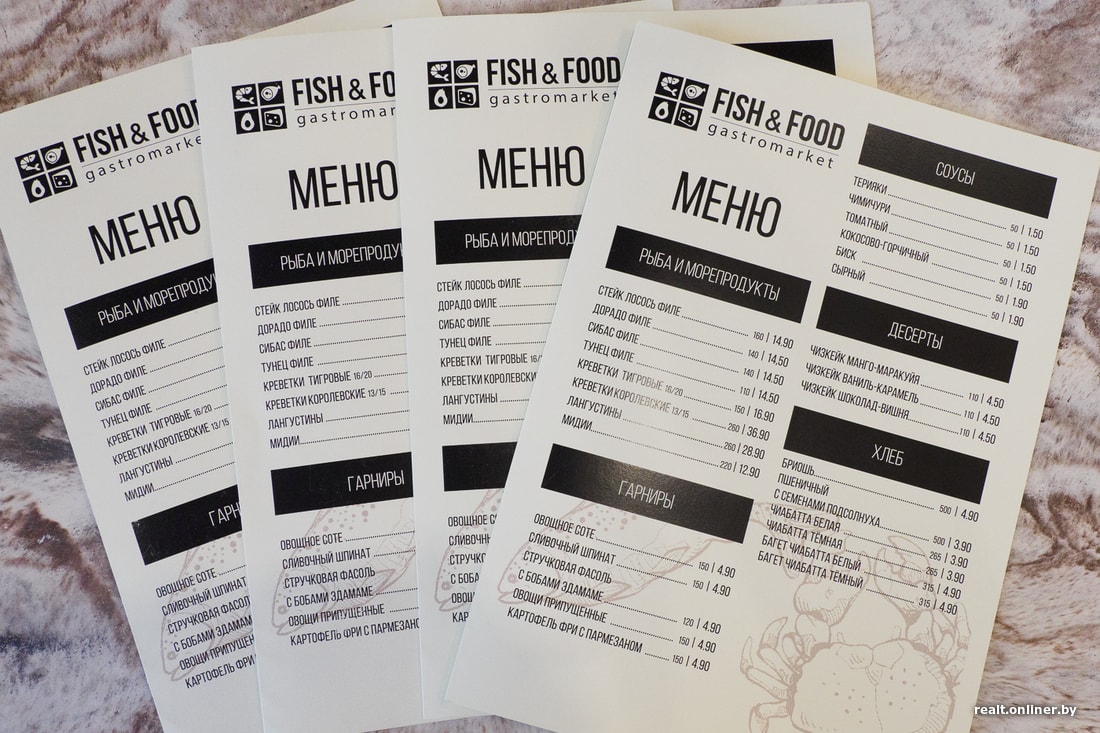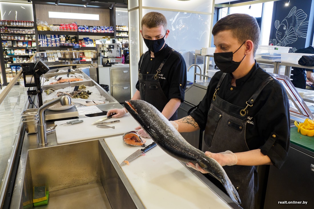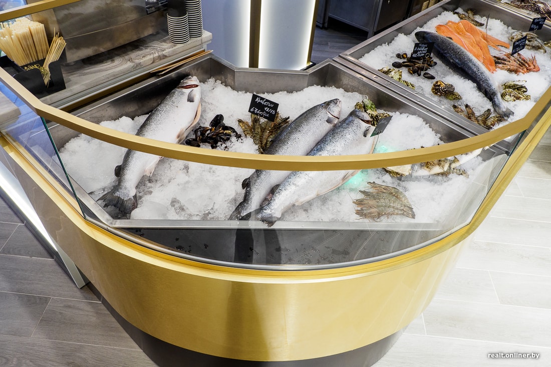 — Основной акцент в Fish&Food сделан на морепродукты, — продолжает Алексей. — Соответственно, у нас работают фишмонгеры, которые разделывают, чистят, вакуумируют выбранную посетителями рыбу. Важный момент: клиент заберет только те части рыбы, которые захочет и посчитает нужными сам.