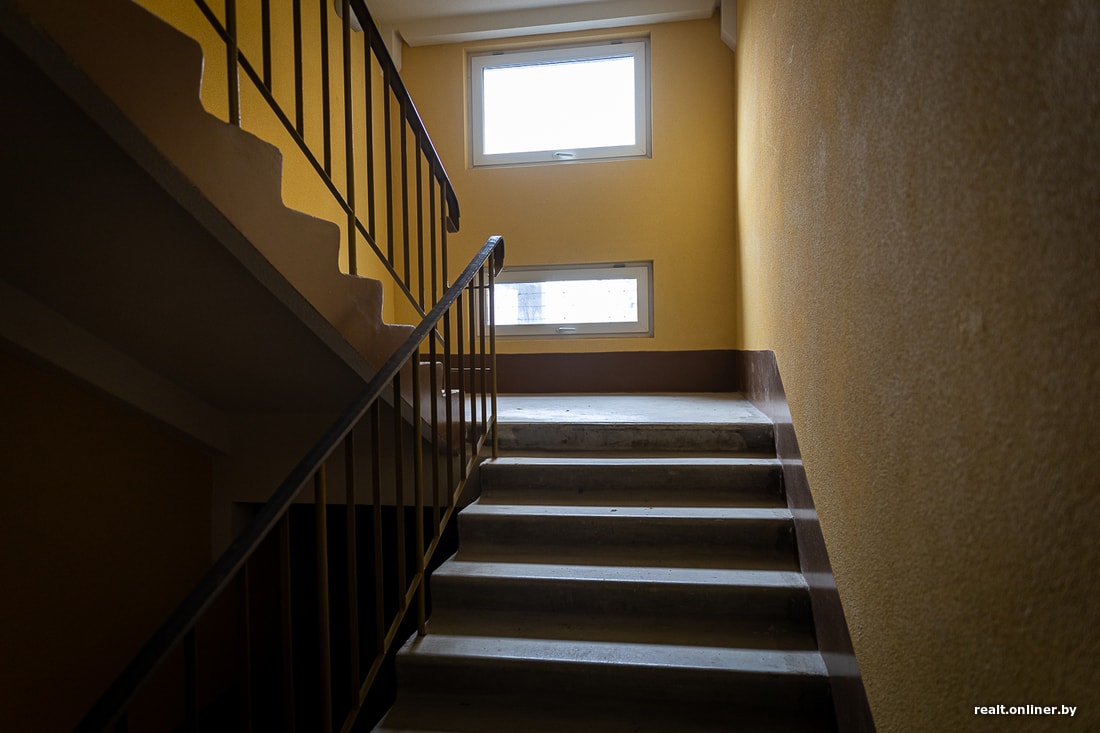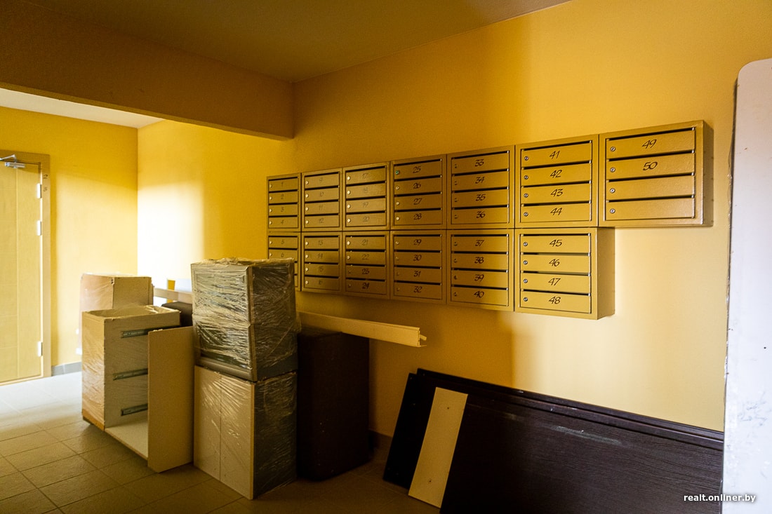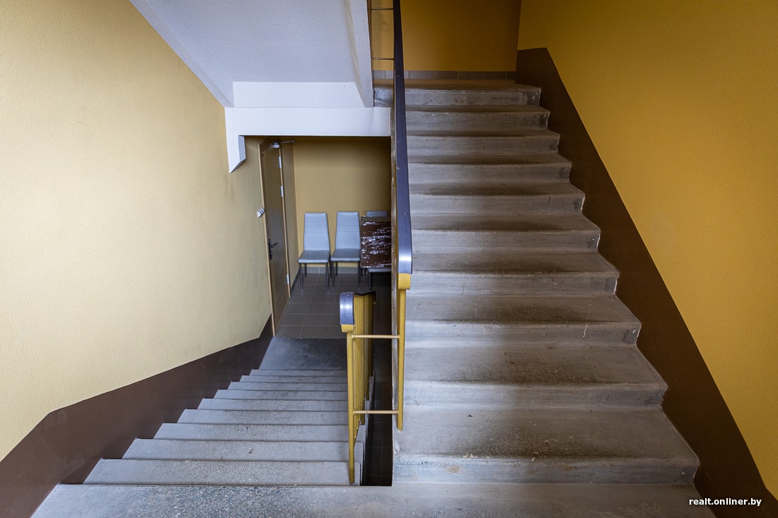 В подъезде красота, увы, заканчивается: поддержать общую тему рисунком на стене или картиной застройщик, видимо, не захотел. Желто, аккуратно, утилитарно.