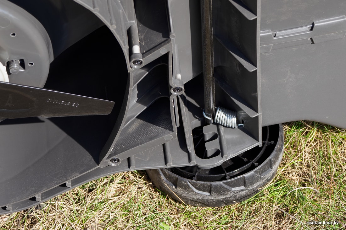 Регулировка высоты скоса в моделях максимальной комплектации происходит путем одного плавного нажатия на рычаг. В более простых аппаратах иногда надо все четыре колеса по отдельности перемещать в нужные пазы.