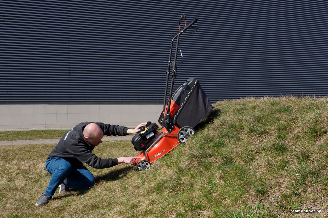В каком-то плане бензиновые газонокосилки — неженки. Их нельзя «заваливать» набок и спускать с крутой горки «головой» вперед. Если вы проведете такой эксперимент, масло затечет в глушитель или фильтр либо и туда, и туда. А дальше — очень грустная история.