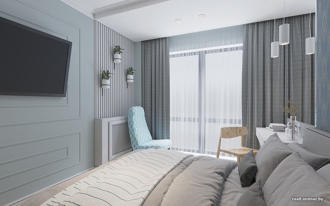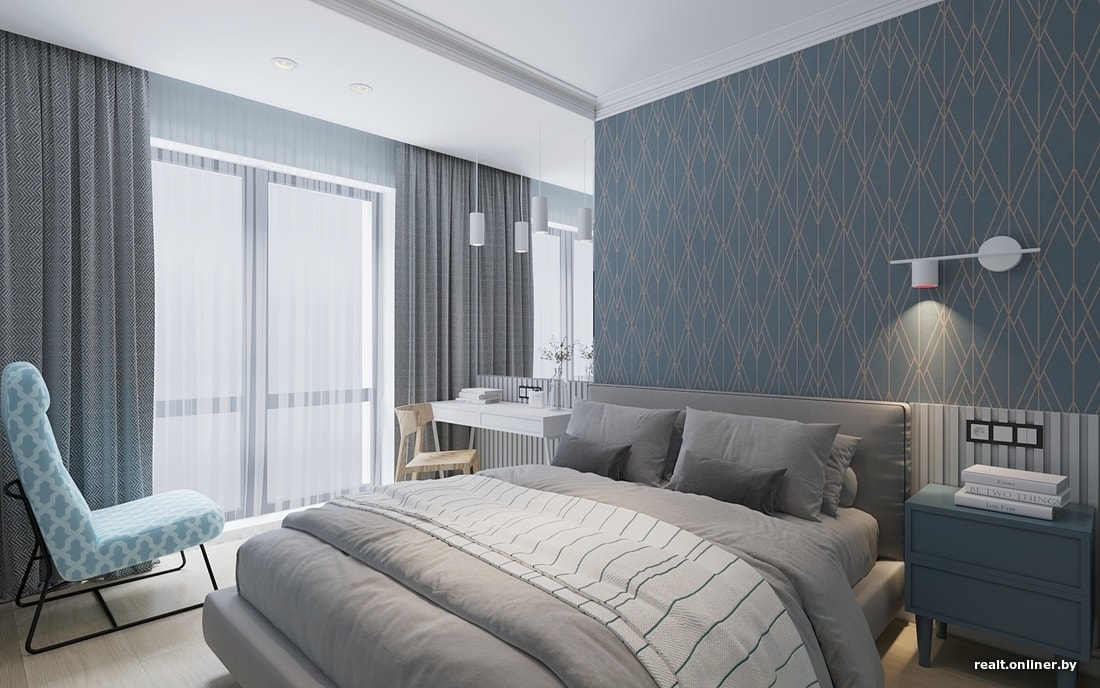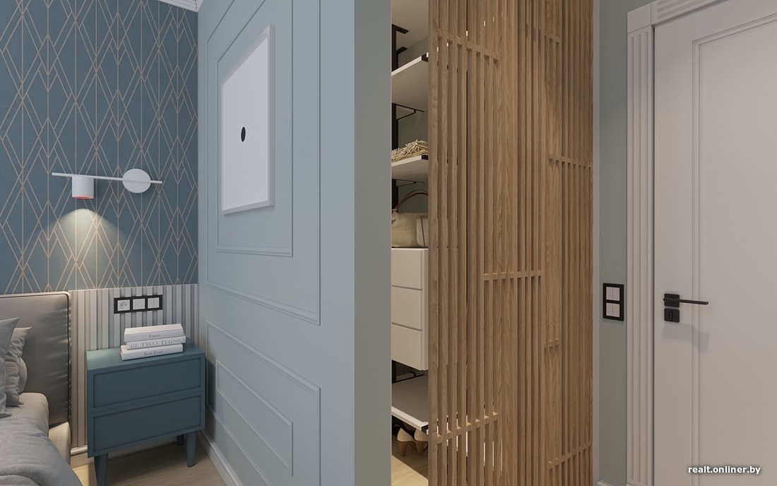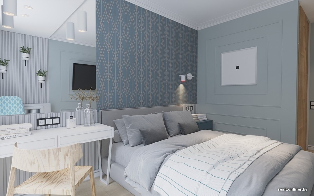 — В спальне вместо одной прикроватной тумбы я предлагаю поставить косметический столик. Его можно использовать как прикроватную тумбу и сэкономить место.