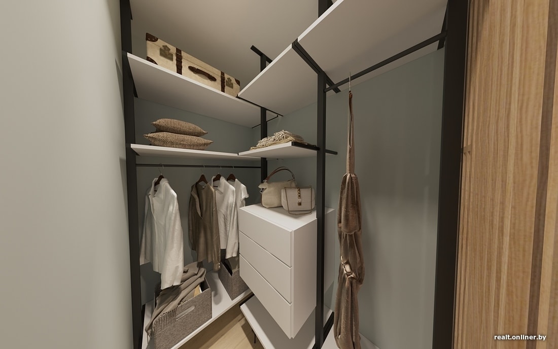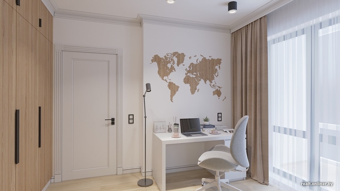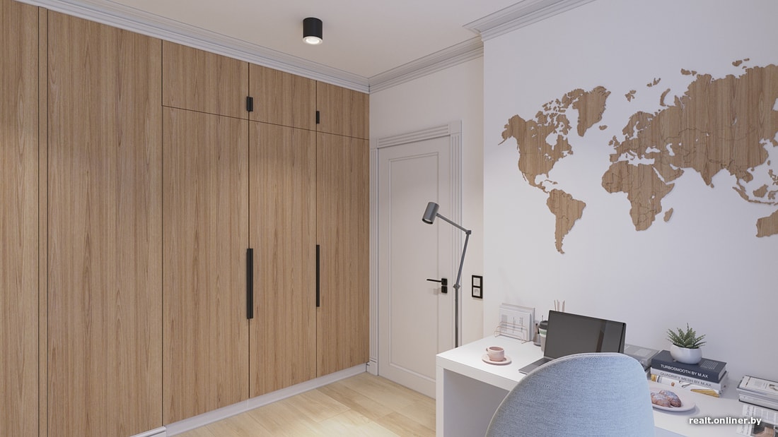 — В кабинете (детская в перспективе) был запрос о гардеробной. Я предлагаю сделать шкаф, чтобы сохранить площадь. Потому что для ребенка важнее пространство, чем места для хранения.