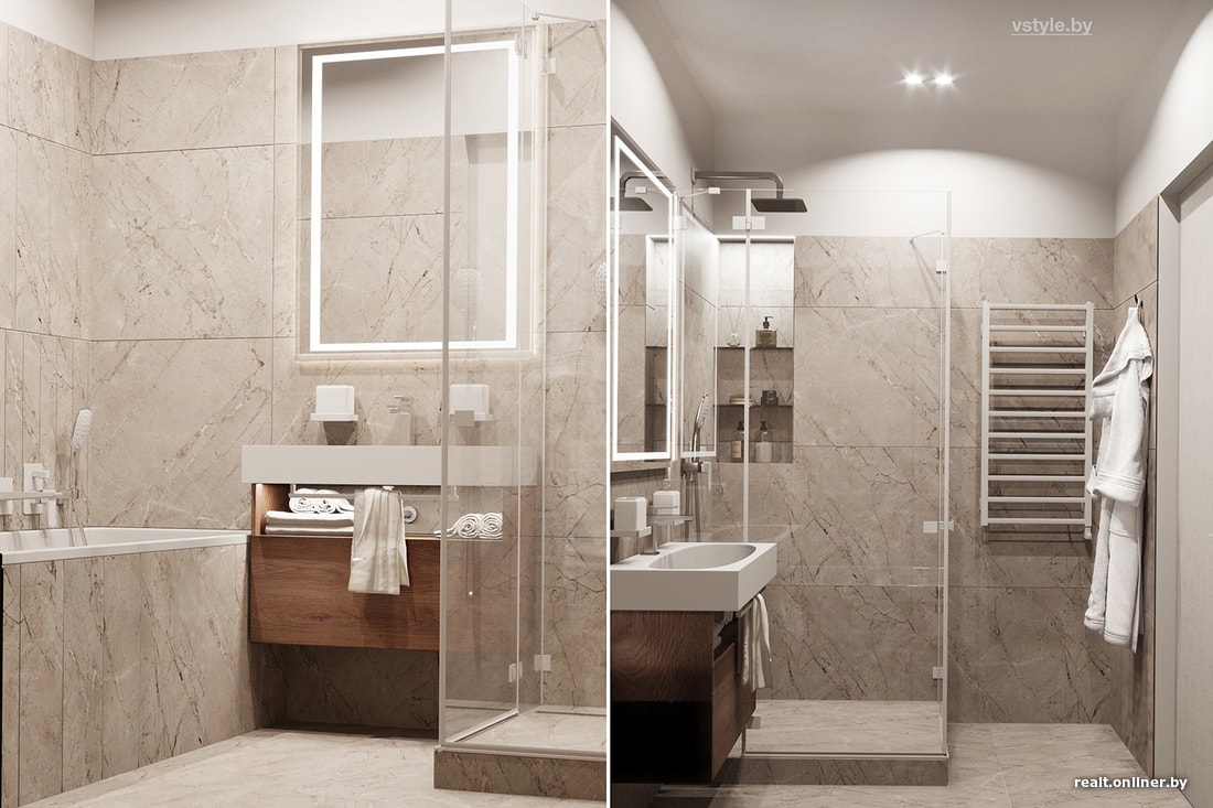 Предусмотрены отдельный санузел и ванная комната. В ванной комнате, благодаря небольшому смещению перегородки в коридор, разместили ванну длиной 1800 мм. Есть и душевая кабина.
