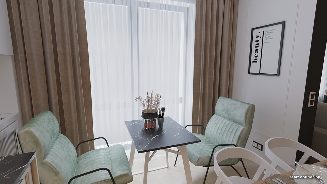 На кухне возле окна размещена зона для бьюти-дел, которую можно использовать также для отдыха или работы за ноутбуком.
