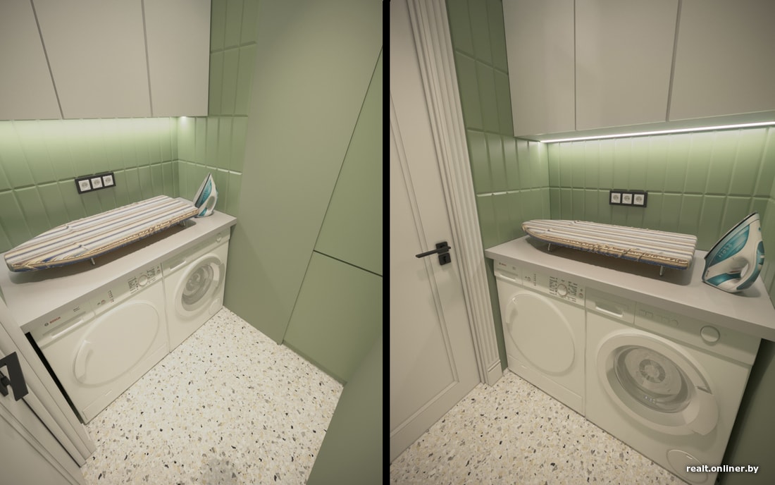 В постирочной установлены стиральная и сушильная машины, размещен хозблок с гладильной доской. Для обогрева и чтобы в постирочной не было сыро, предусмотрен электрический полотенцесушитель. Есть место для установки бойлера.