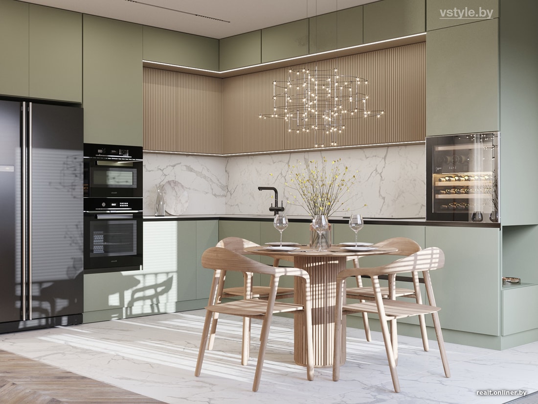 В кухню сделан один вход со стороны гостиной, что освободило дополнительную площадь для встроенной бытовой техники. Обеденный стол и диван расположили так, чтобы было удобно смотреть телевизор, который находится в гостиной.