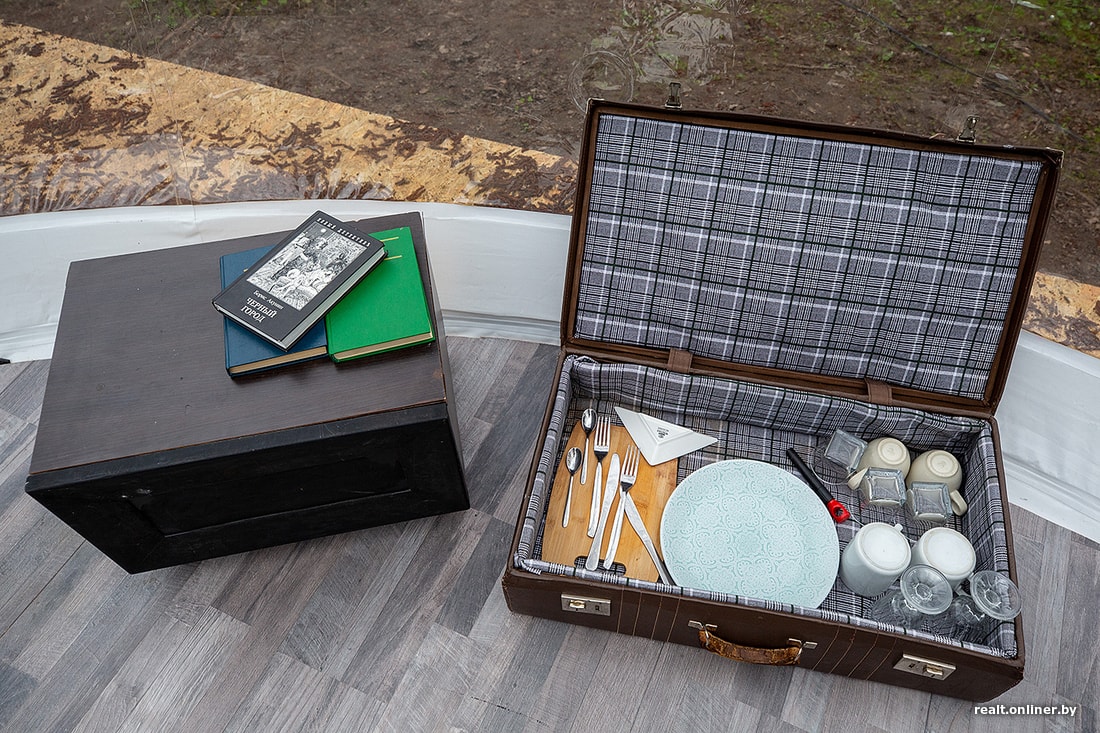 Зато в самом пузыре было куда больше привычных городскому жителю вещей: пылесос, кофеварка, электрочайник, переносной холодильник, светильники… Вот только обещанную музыкальную колонку мы так и не нашли — возможно, умыкнул предыдущий постоялец. В чемодане обнаружили посуду (по паре тарелок, бокалов, стаканов и кружек), разделочную доску, столовые приборы и штопор. Хорошо, что не взяли ничего из этого с собой.