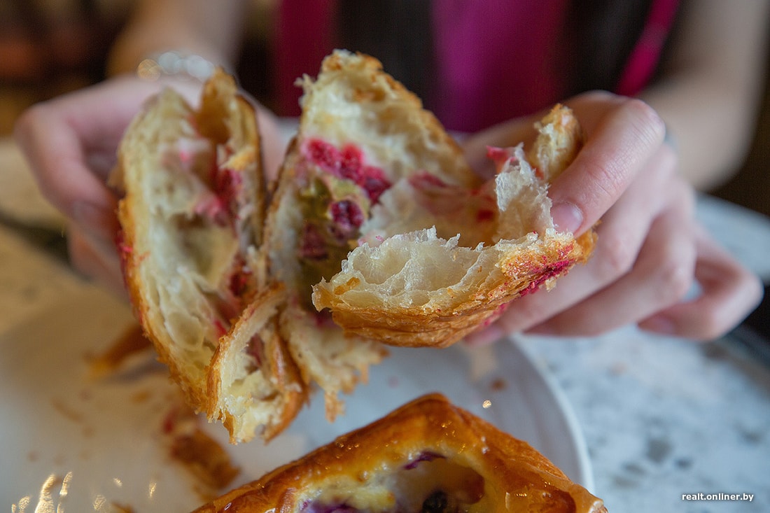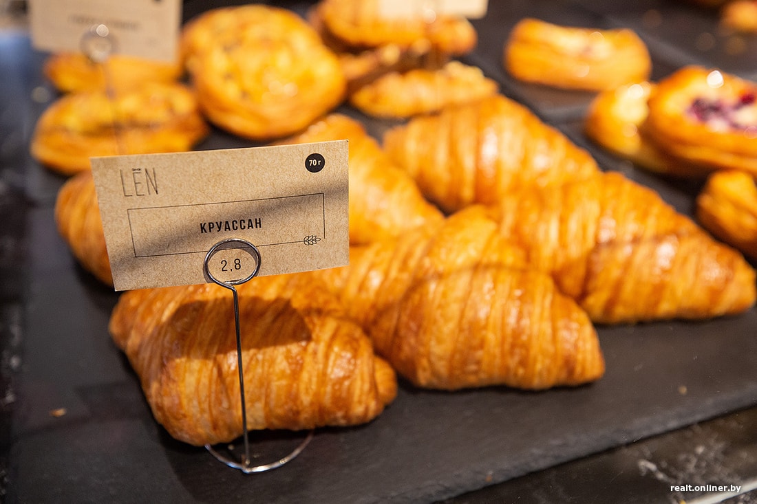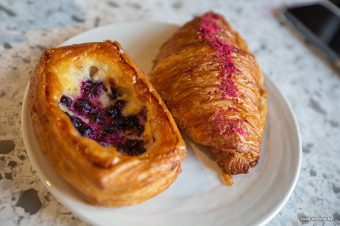 Выбор слоеной выпечки уже довольно привычный: круассаны, даниши, паштейши. Почему привычный? Потому что так повелось, что кофейни разных размеров и форматов заказывают продукцию у известных минских пекарен — так удобнее и не нужно заморачиваться с кухней. Одни и те же круассаны разлетаются по всему городу, и, допустим, круассан с малиной и фисташкой от Len можно попробовать не только в сети Len.