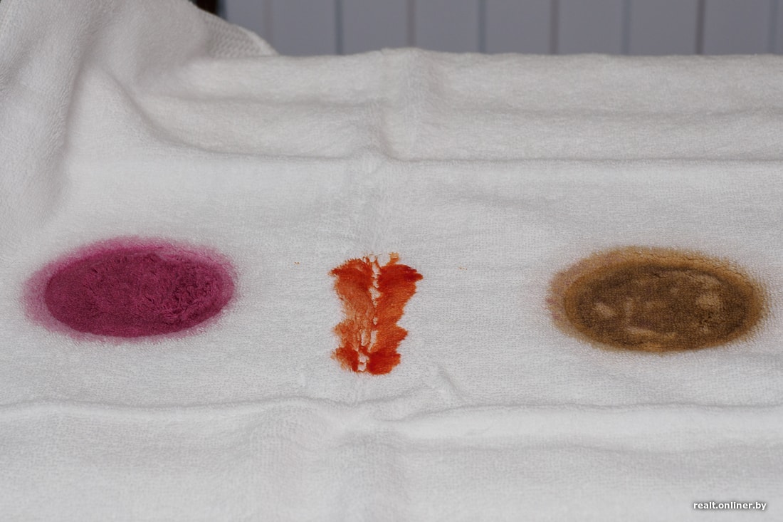 Но прежде чем «запрячь» машины, надо подготовить «материал». В качестве холста, на который мы нанесли жуткие пятна, выступили одинаковые белоснежные полотенца (100-процентный хлопок). Тест действительно получился жесточайшим: на идеальную, как погожий весенний денек, ткань мы нанесли самые популярные и сложные пятна — красное вино, черный кофе, подсолнечное нерафинированное масло, тональный крем и кетчуп.
