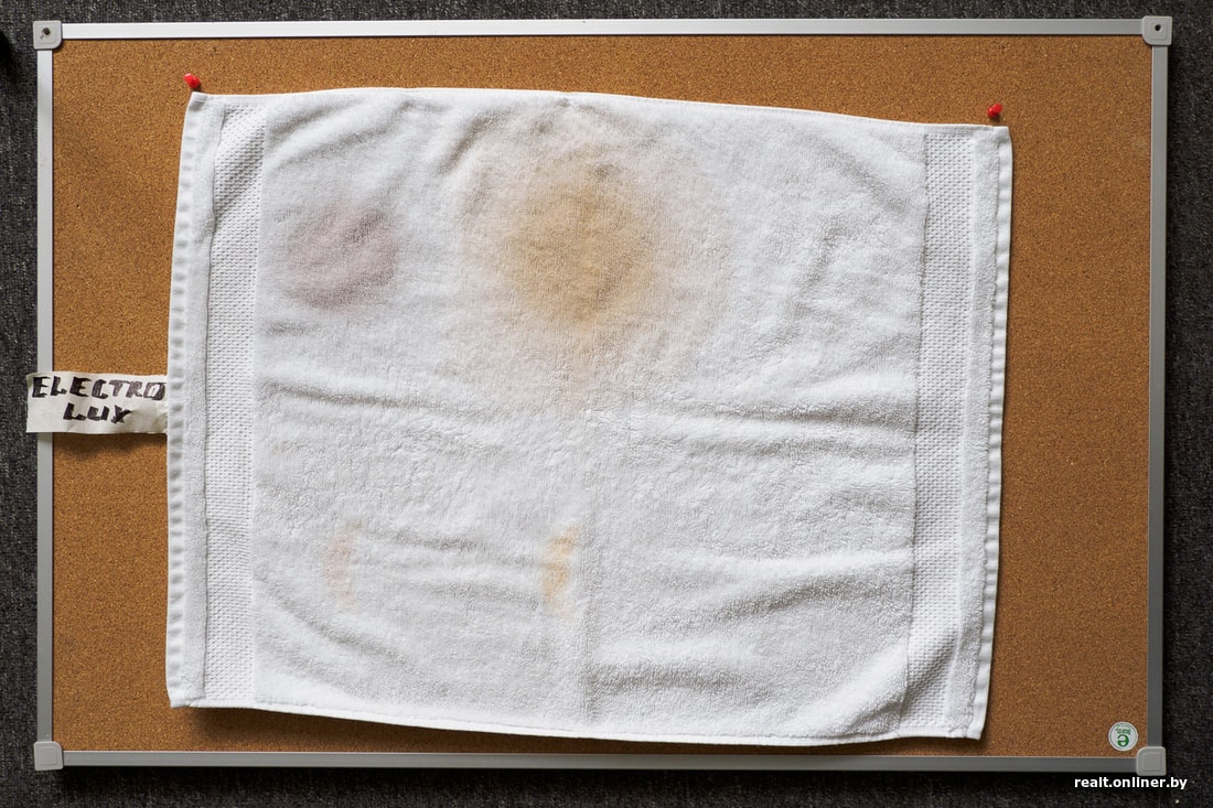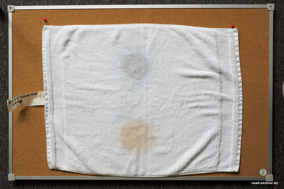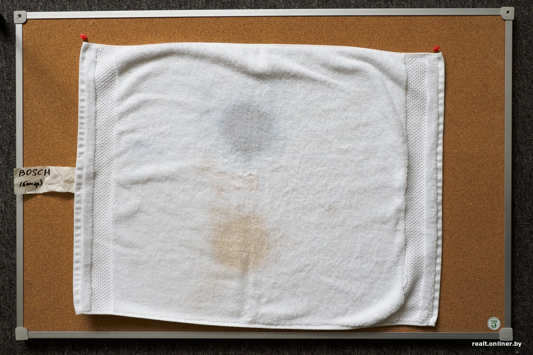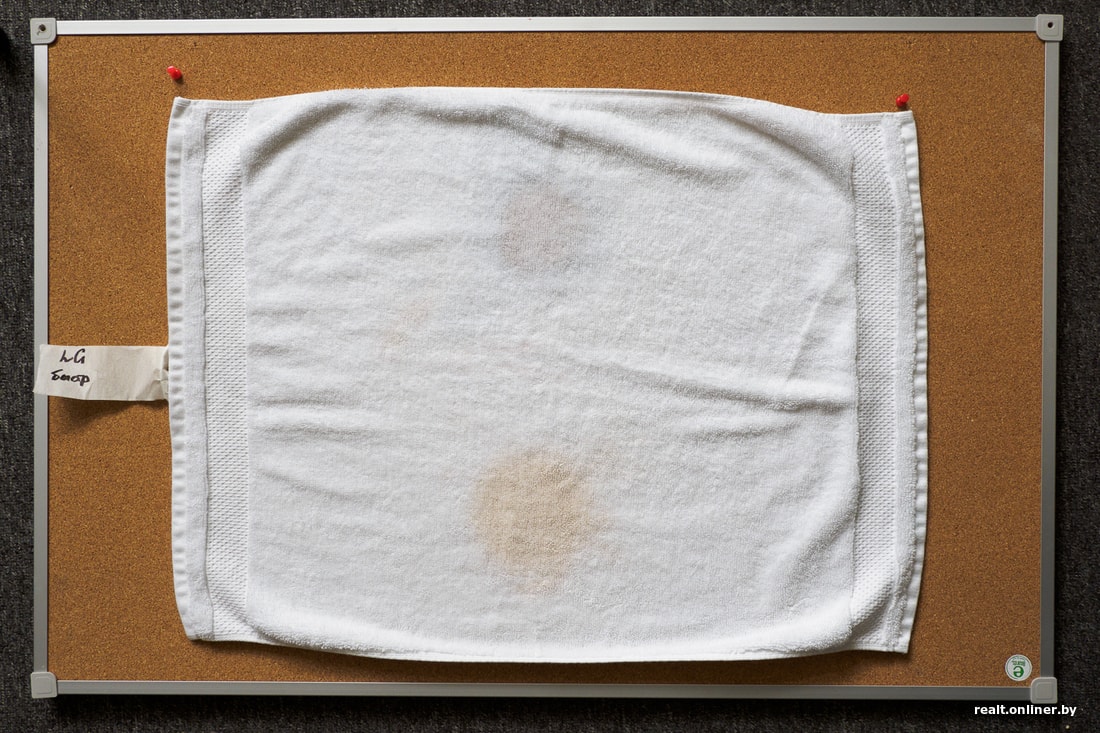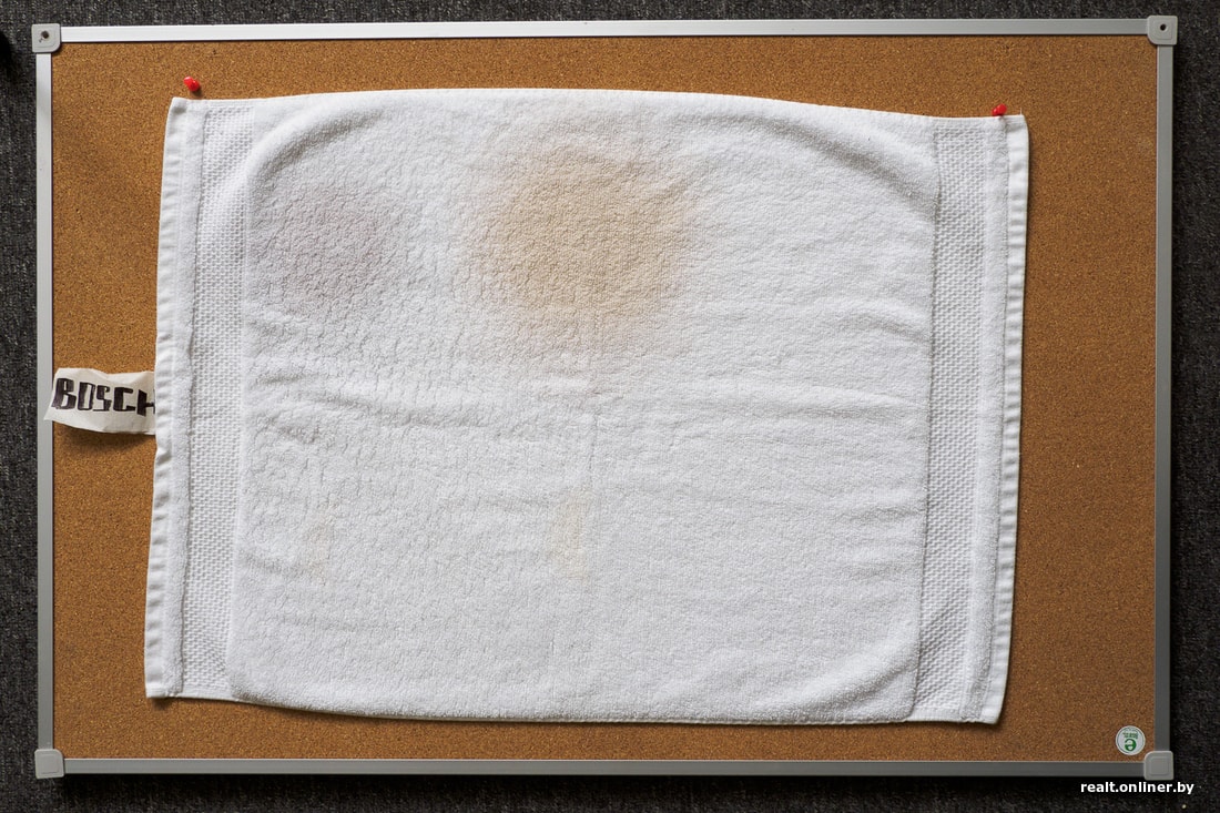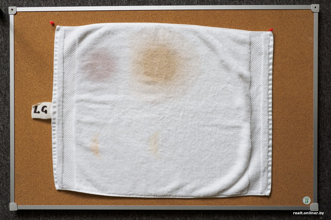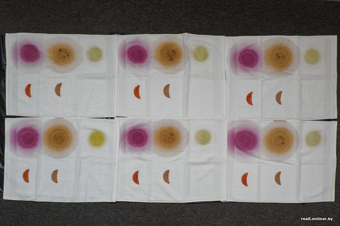 А теперь покажем, что устройства настирали и насушили (как видите по таблице, кое-что пришлось изрядно досушивать естественным путем). Самыми трудновыводимыми оказались пятна от кофе и вина, а вот подсолнечное нерафинированное масло легко покинуло наши полотенца. Тональный крем и кетчуп тоже не очень-то хотели уходить в небытие, но все же заметны меньше. Конечно, результаты могли бы быть лучше, если бы мы «сварили» полотенца при 60 или даже 90 градусах. Однако мы исходили из того, что пачкаются не только полотенца, а стирать любимую рубашку при такой высокой температуре вряд ли кто-то отважится.