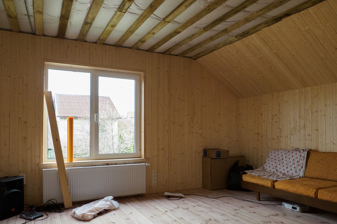 Мансарда надстраивалась по каркасной технологии. Сам деревянный каркас собирала бригада строителей, в качестве утеплителя использовалась эковата (древесная целлюлоза + бура + борная кислота). В стенах и кровле по 20 см утеплителя. Старый сруб также утеплялся эковатой.