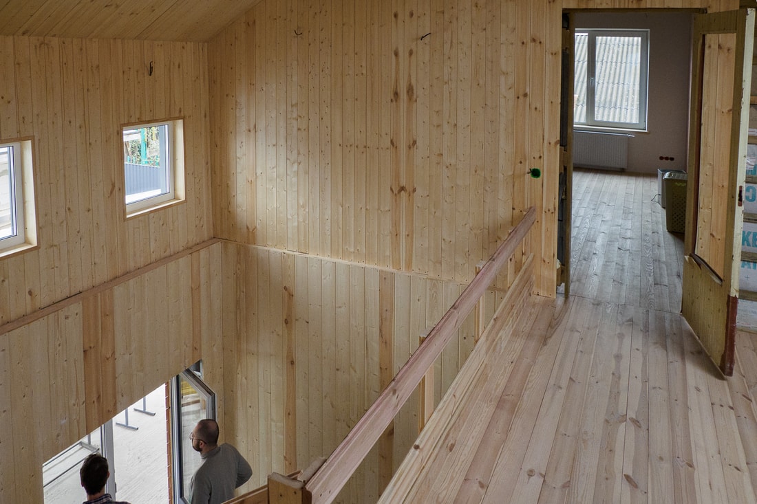Стены обшиты фальшбрусом. Напоминает дачу, но это лишь пока, в дальнейшем стены покрасят.
