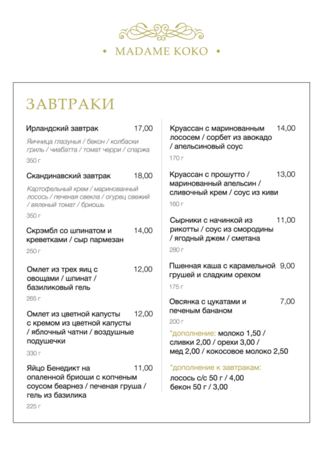 Концепция кухни — авторская с молекулярными элементами. Есть большое меню завтраков, которые действует до 16:00. Цены — выше среднего.