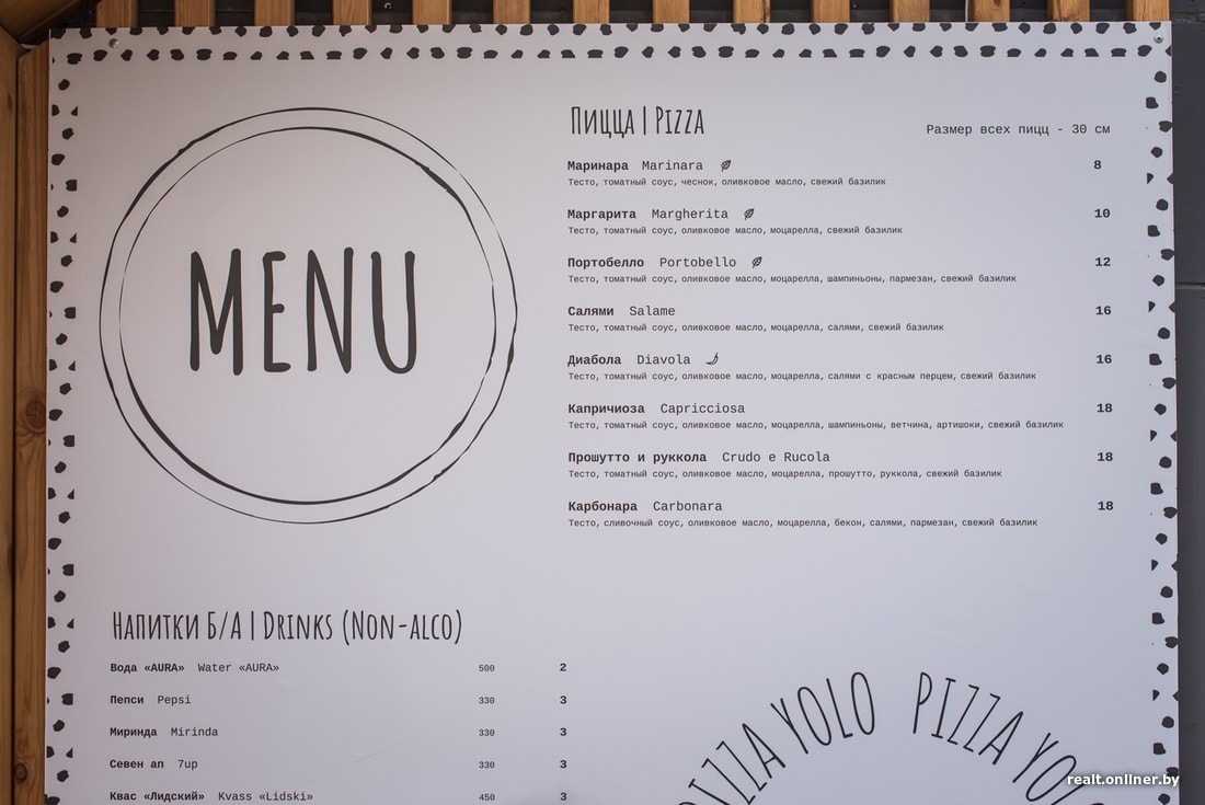 В Pizza Yolo делают то, что всегда пользуется спросом у минчан, — неаполитанскую пиццу в печи. Цены, в принципе, как везде. Из-за быстрого, уличного формата приготовления еды скидок на нее нет.