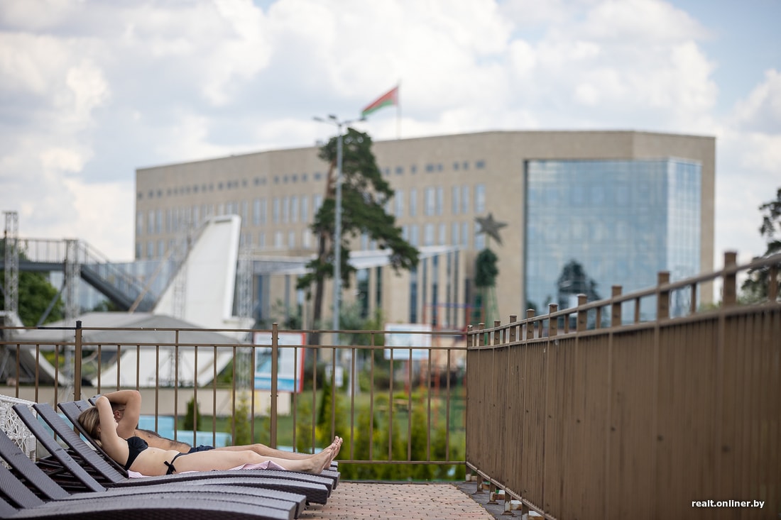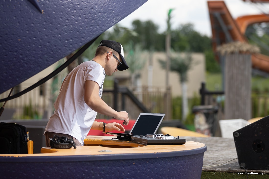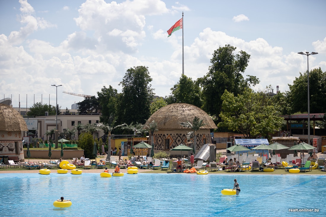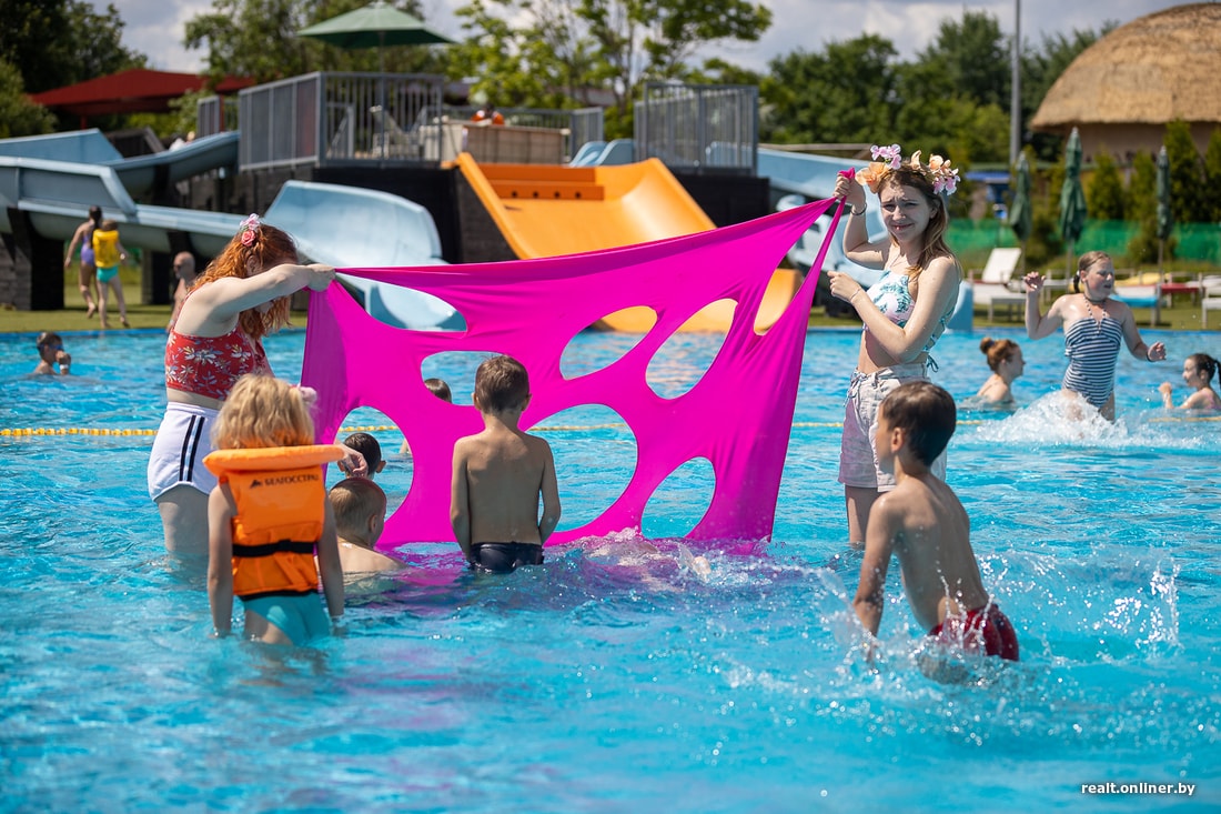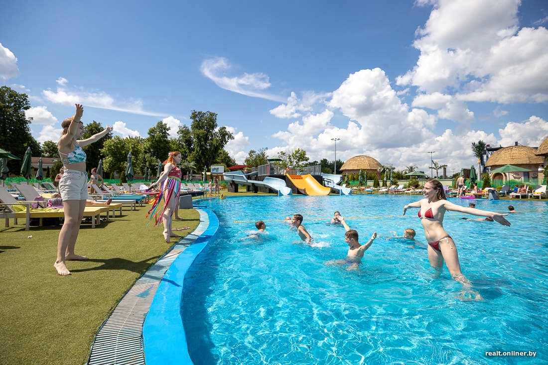 Хотя на сегодня и обещали грозы, а настроение от прочтения новостей становится чернее любой тучи, минчан это не остановило — в аквапарке плавают под музыку обгоревшие (и не очень) от первой июньской жары люди. Кто-то пришел с семьей, кто-то — с друзьями.