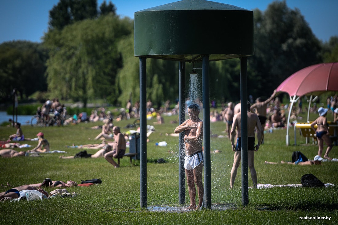 Стационарных мангалов на пляже нет, так что некоторые приходят со своими. Зато есть раздевалки, душевые кабинки, скамейки с непонятными навесами из металлической сетки, которые способны разве что придать вашему загару неповторимый узор в клеточку. В целом же пляжное оборудование помнит разные времена в истории Беларуси и выглядит довольно уставшим.