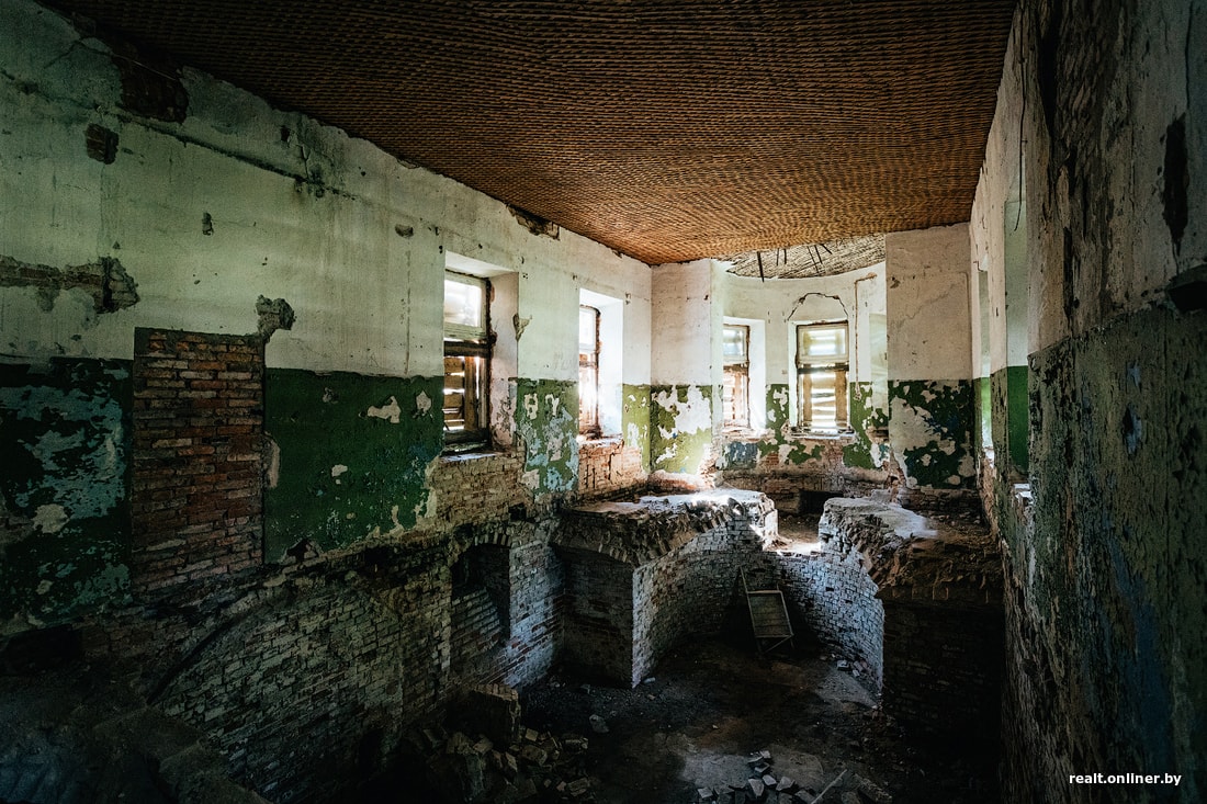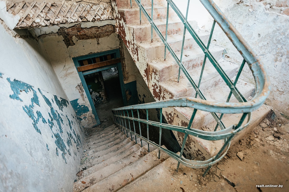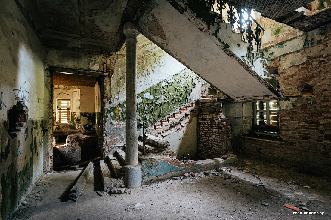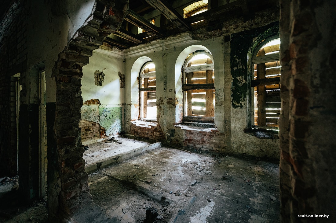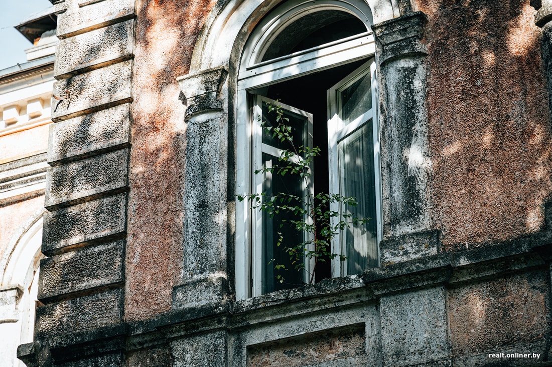 Дом находился в неплохом состоянии, пока был занят школой-интернатом. При ее переезде в большой комплекс по соседству должная консервация проведена не была, и время быстро начало брать свое. Но кровля сохранилась, а для внутреннего состояния здания это имеет принципиальное значение.
