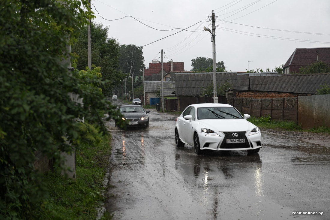 Никакая она не каменная и уж точно не горка. Вчерашний ливень, выдавший примерно по 37 литров на каждый минский квадрат, показал, что на западе столицы при определенном стечении обстоятельств можно запускать гондолы (наконец-то и хоть где-то). Утонувшие авто, залитые участки, эвакуация людей на лодках — это все происходило здесь, на улице Люцинской, разделенной автомобильной дорогой на сухую многоэтажную часть, где, по словам местных жителей, воды было «по косточку, ну, может, чуть выше», и мокрую зону усадебной застройки. Onliner приехал в эпицентр вчерашнего ЧП, чтобы заснять последствия потопа и поговорить с хозяевами пострадавших домов.