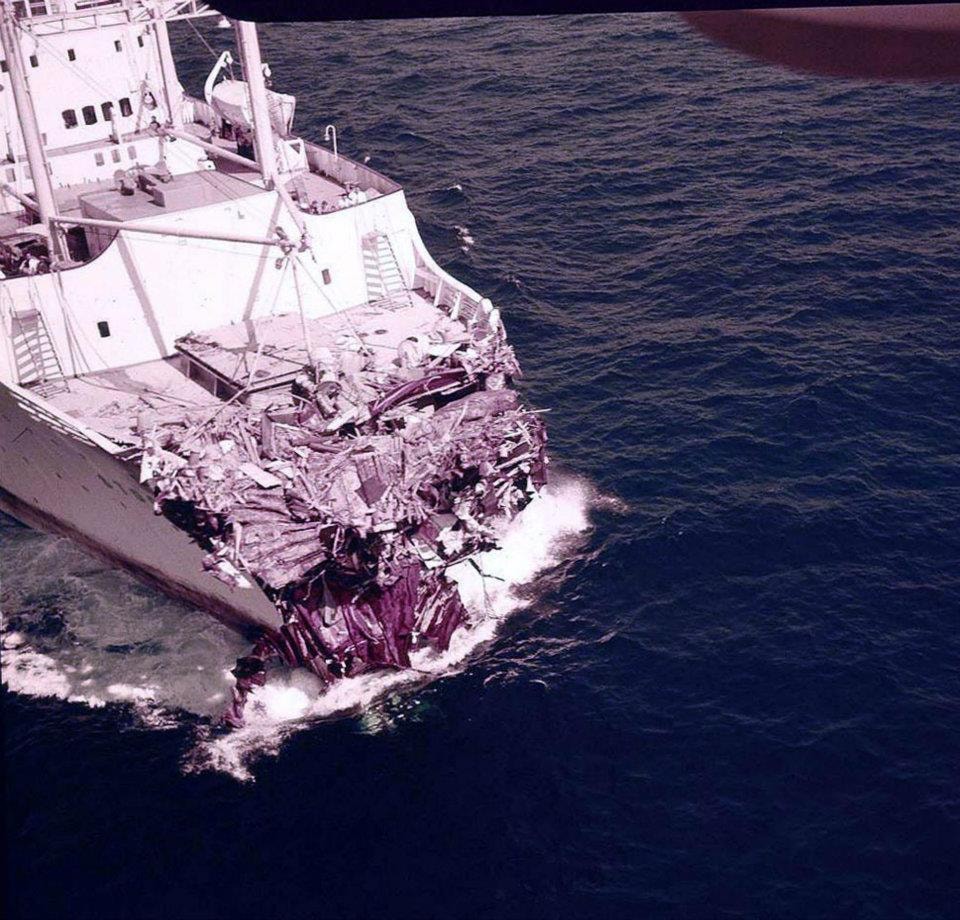 «Стокгольм» держал путь на все тот же плавучий маяк Nuntucket, но, в отличие от «Андреа Дориа», его плавание проходило в ясную погоду. Впрочем, и на борту шведского корабля имелся радиолокатор. У маяка он должен был лечь на нужный маршрут к родным скандинавским берегам. Вместо этого в 23:10 нос «Стокгольма» вонзился в беззащитный правый борт итальянского лайнера в районе его рубки.