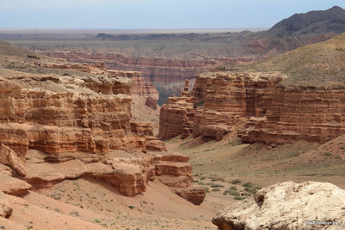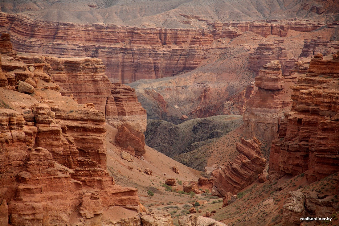 Ущелье протянулось на 154 км по долине реки Чарын неподалеку от границы с Китаем и Кыргызстаном. Самую зрелищную часть каньона называют Долиной замков. Слишком уж похожи красно-оранжевые скалы на сказочные сооружения. А кто-то видит в них фигуры динозавров, сторожевые башни, головы уснувших великанов. Вот уж действительно величественная архитектура, созданная самой природой.