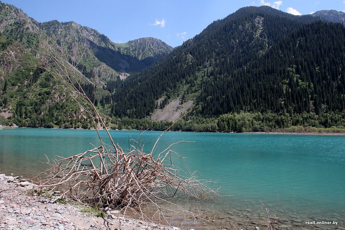 Неподалеку есть еще одно удивительное место — озеро Каинды с «затонувшим лесом». Оно находится в труднодоступном горном ущелье на высоте 1660 метров над уровнем моря. Когда-то здесь петляла горная речушка, а к небу тянулись величавые ели. Все изменилось в 1910 году, когда случилось землетрясение. Оползень заблокировал течение строптивой реки, и вода затопила реликтовый лес. Сейчас из лазурного озера торчат почерневшие пики горных елей, похожие на мачты затонувших кораблей.