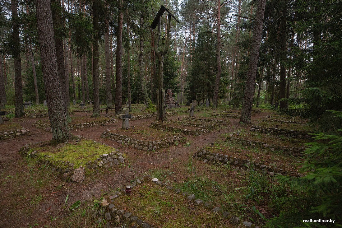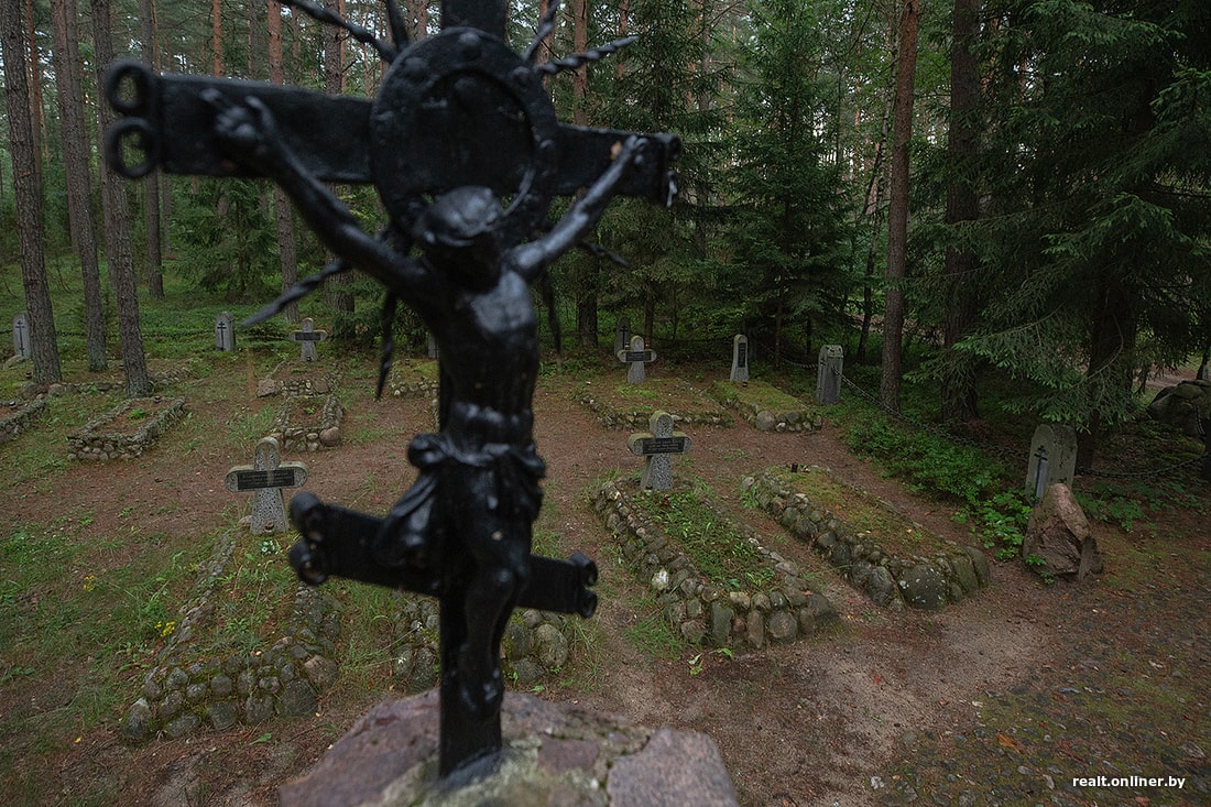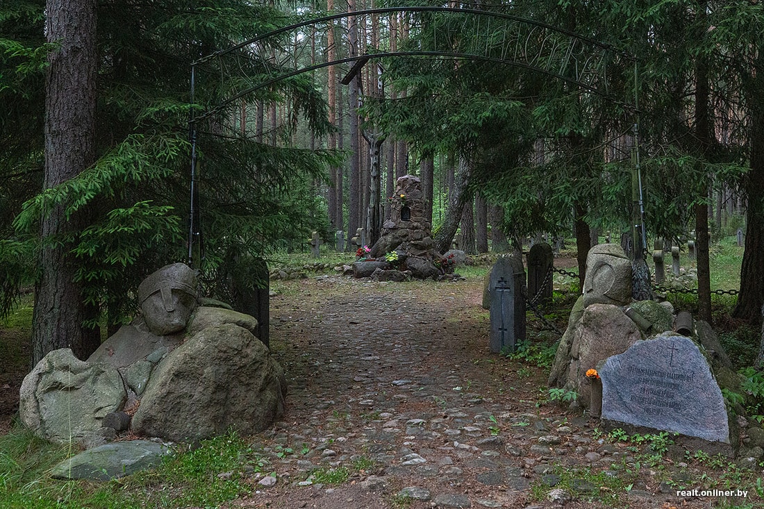 В день Х мы с коллегой выкатились из удушающе жаркого Минска и где-то через час-полтора оказались в окутанном тучами Забродье. К небольшой деревеньке, состоящей всего из десятка домов, вела живописная лесная дорога. Среди сосен тайный гость разглядел несколько странных могил. Позже мы узнали, что это лазаретное кладбище времен Первой мировой войны. Его обустроили как раз владельцы усадьбы, они вообще здесь много чего сделали: собственно, даже эту тропу проложили. А кладбище рекомендуем к посещению: очень атмосферное место.