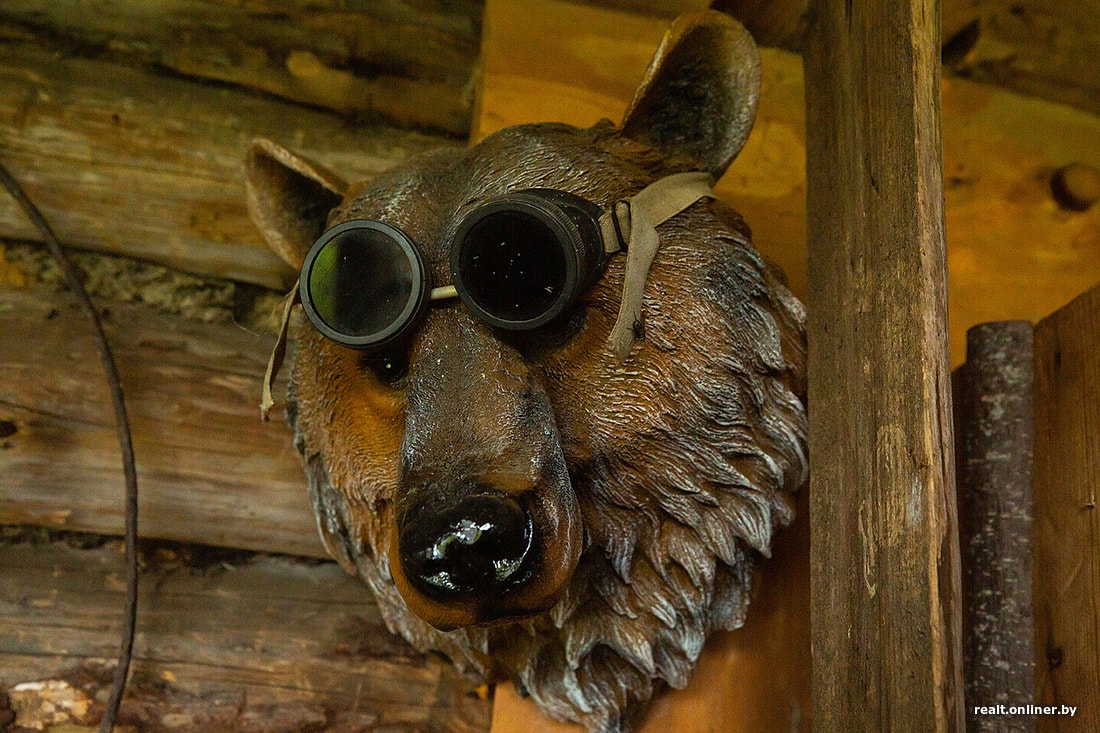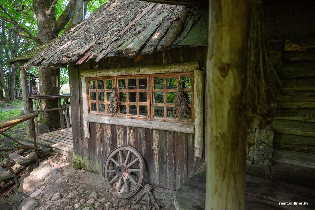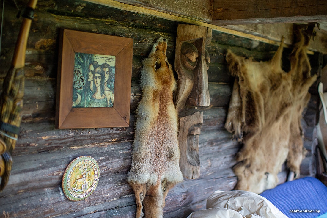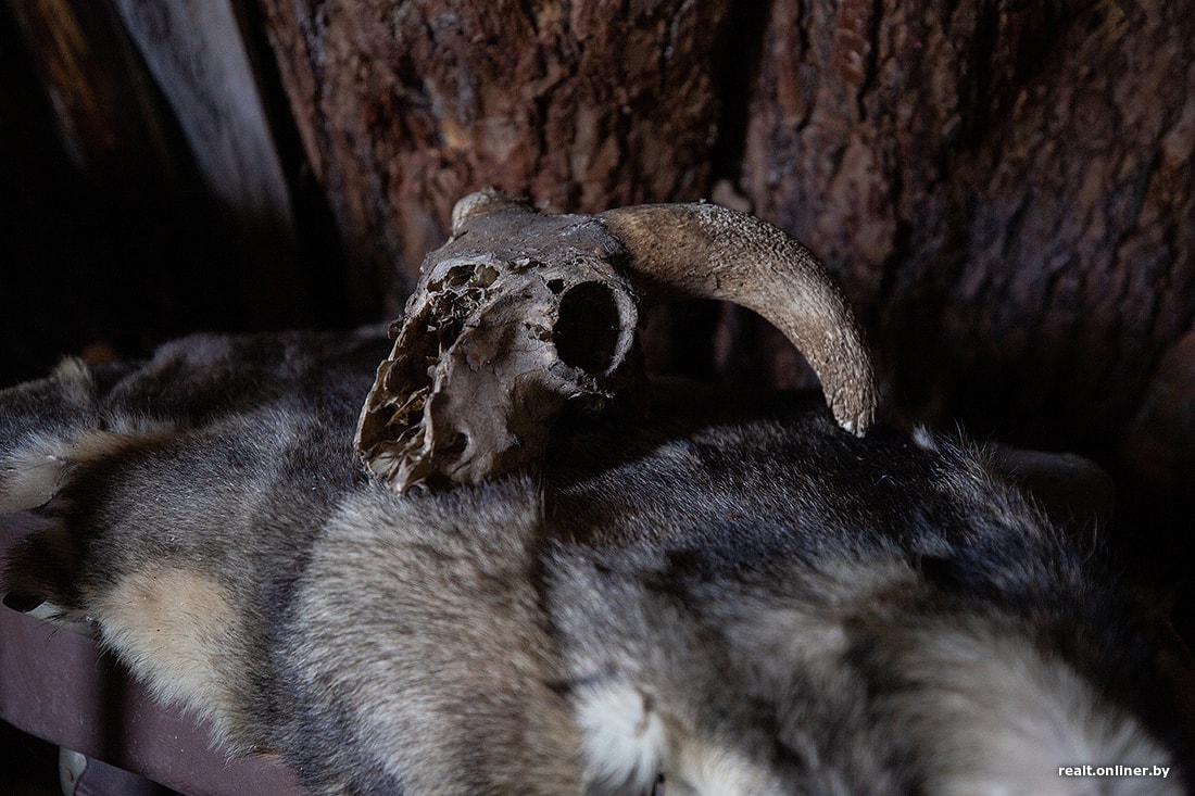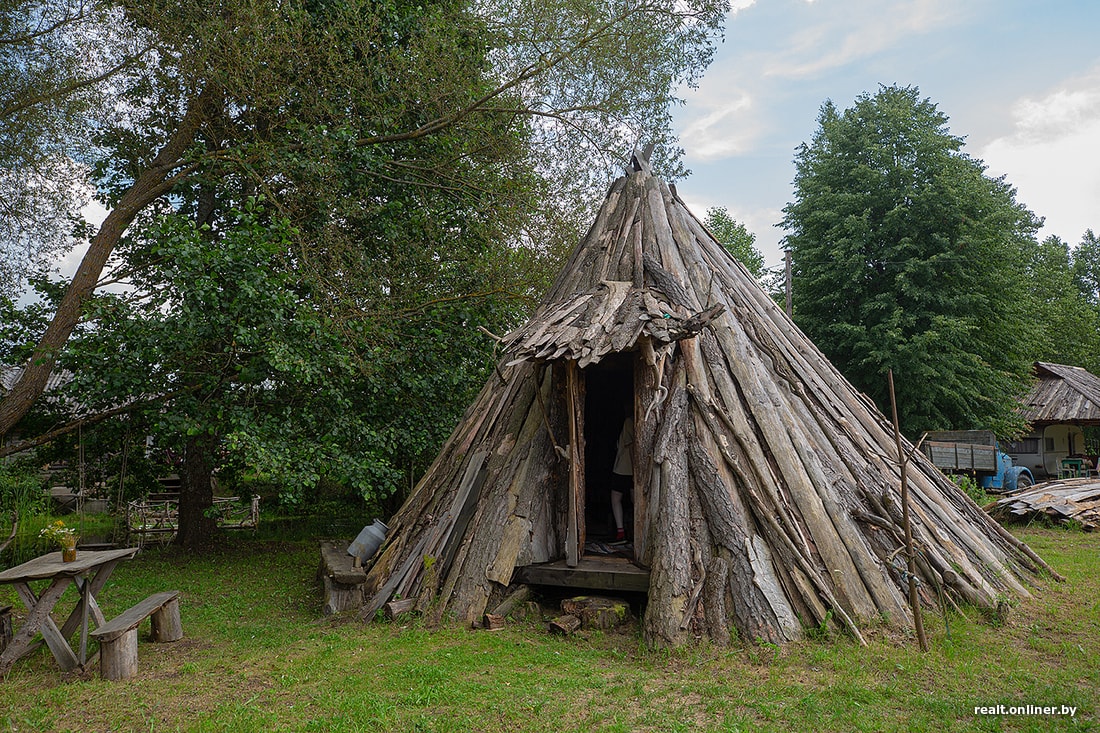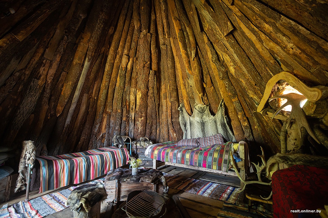 Так как отдыхали мы в «Забродье» в будний день, нам удалось подсмотреть, как выглядит другое жилье, предлагаемое в аренду. Благо двери не были заперты. Самое любопытное — первобытная яранга, похожая на деревянный вигвам. Для антуража тут положили шкуры и кости убитых животных, а прямо посередине комнаты сделали очаг, на котором можно приготовить пищу. Но кое-что все же выбивалось из общей атмосферы, а именно обыкновенные деревенские кровати да сундуки для хранения вещей. Однако, как мы поняли, здесь такая фишка — смешивать артефакты разных эпох в одну кучу и получать какую-то свою, особую забродьевскую реальность.