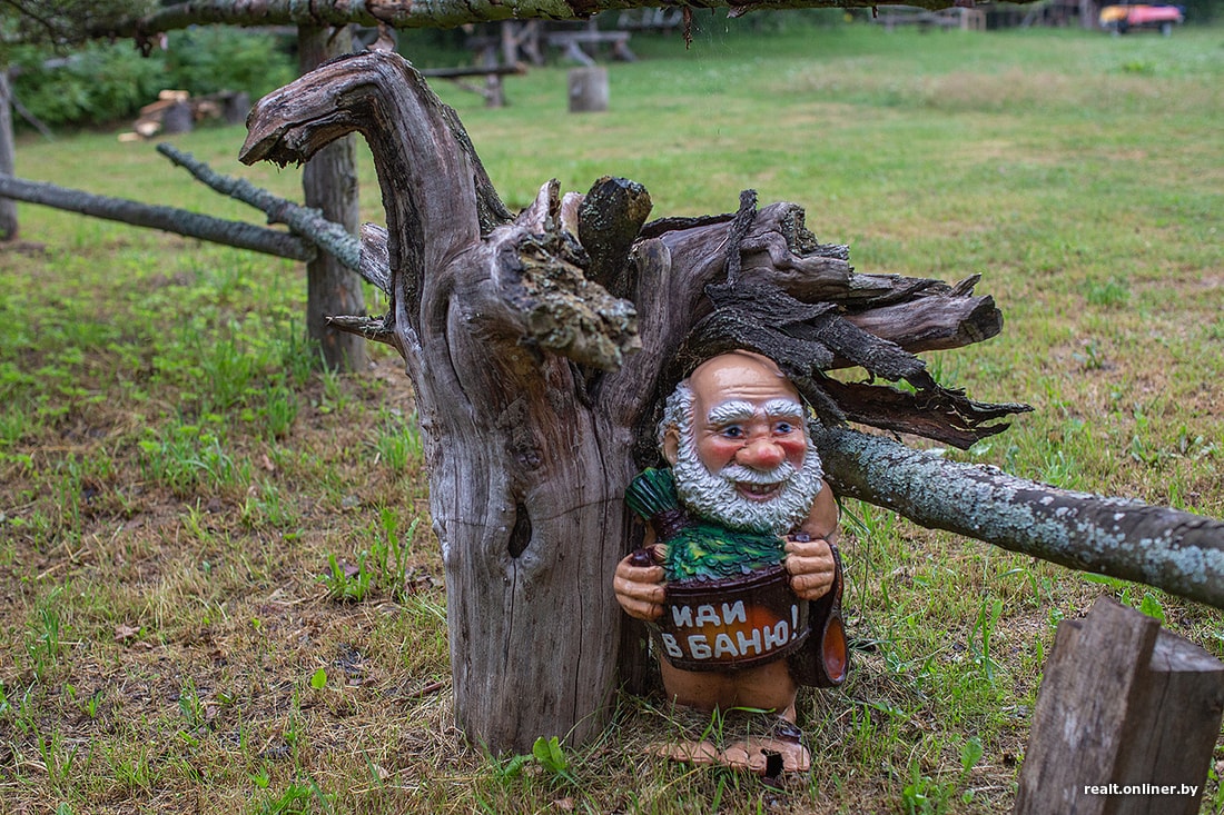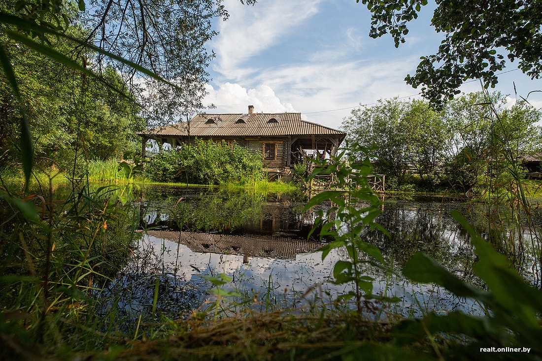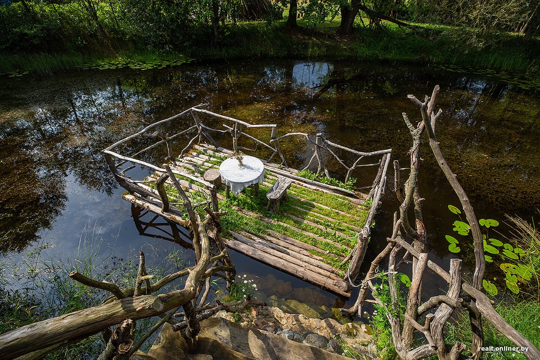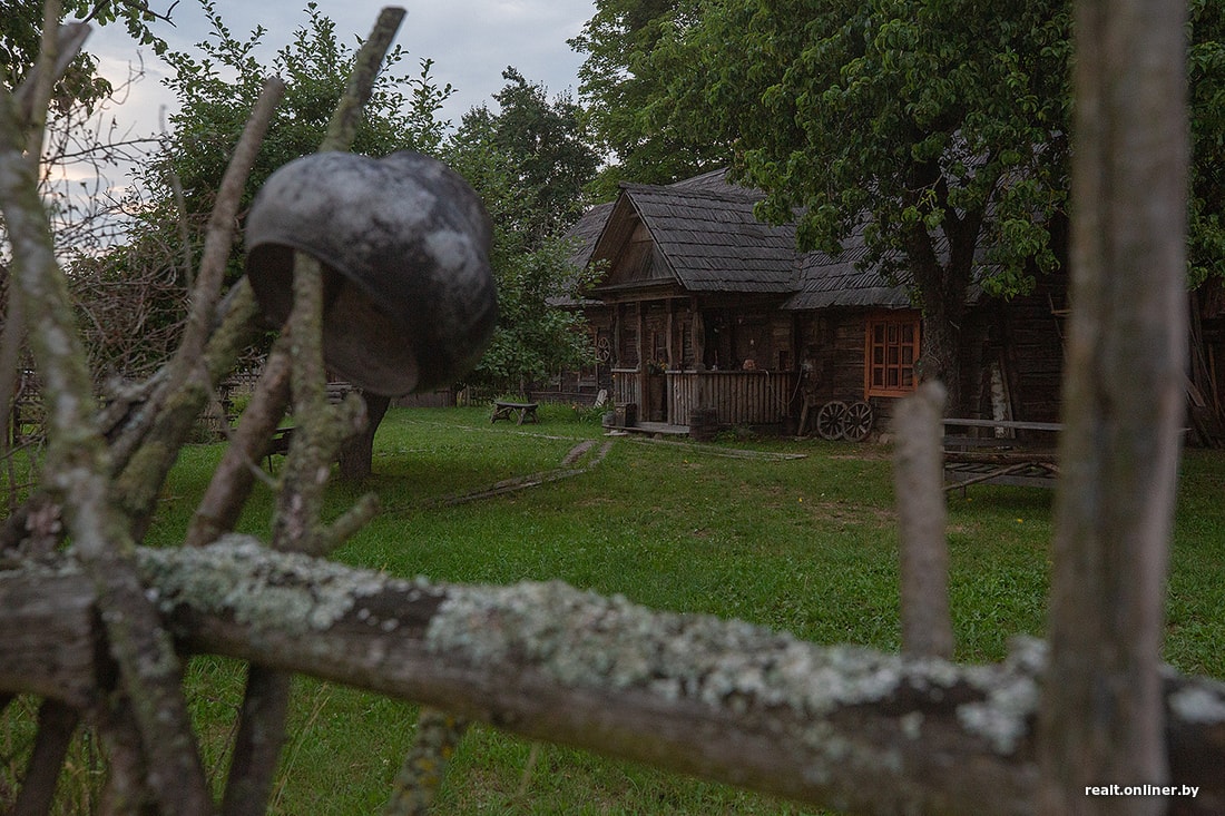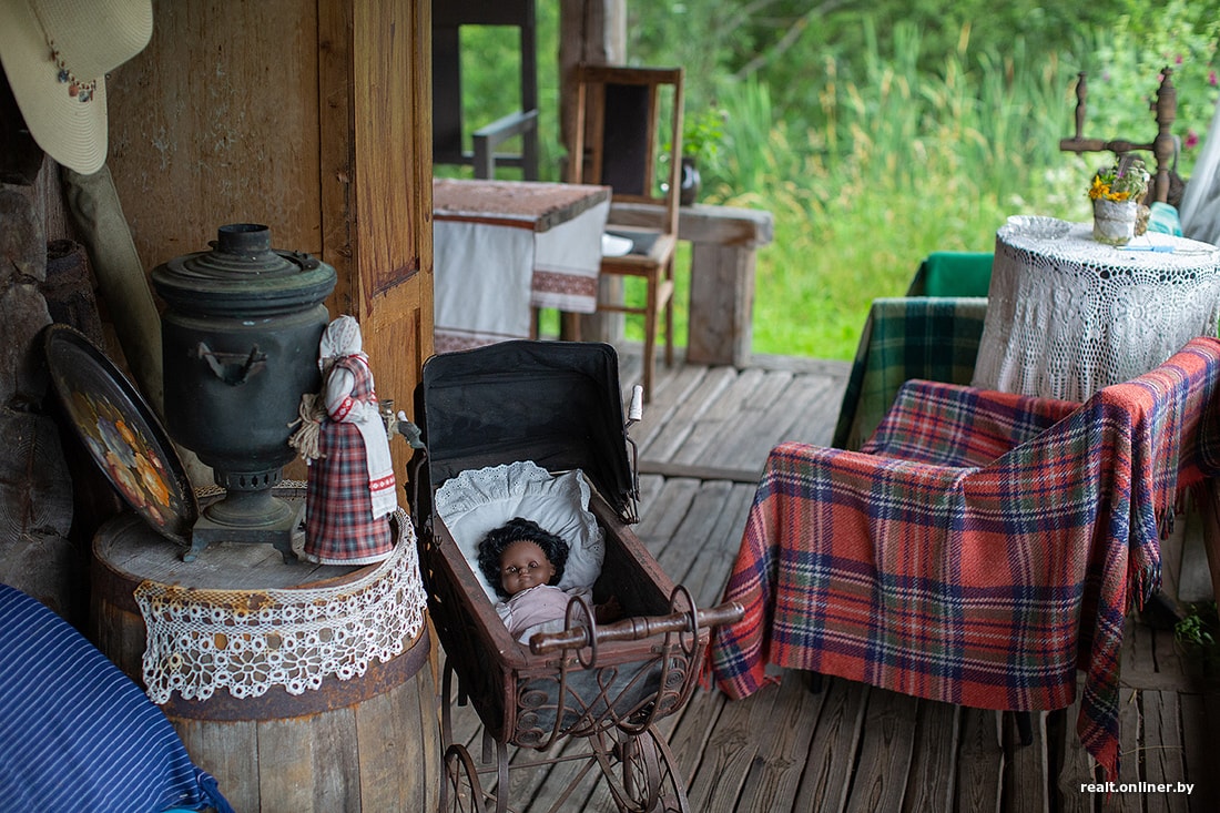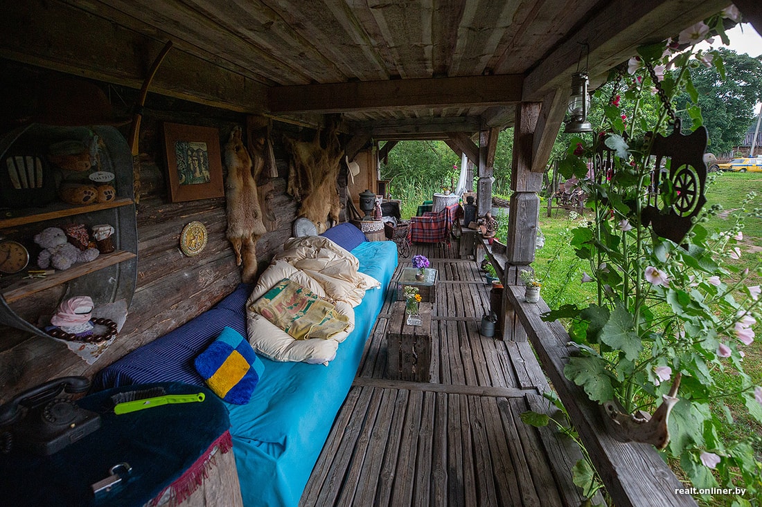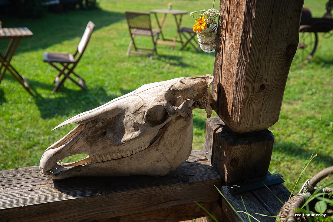 Усадьба находится на краю села. Там мы издалека заметили девушку с огненно-рыжей головой — это была Екатерина, одна из хозяев. Она провела нас к деревянному домику, как будто материализовавшемуся из какой-то белорусской сказки. На первом этаже — баня, в которой в молчаливом противостоянии столкнулись прошлое и настоящее (самовар и кофемашина), и большая терраса по периметру. На ней расположились два обеденных стола с массивными скамьями по бокам, гамак, продолговатый диван, несколько кресел и куча всяких ретро- и не очень вещей — от портрета Ленина и потрепанных жизнью радиоприемников до черепов животных и детских кукол. С одной стороны был спуск к высыхающему пруду, на котором одиноко торчал небольшой плот, поросший травой. Именно на нем мы и хотели покататься. Хозяйка даже предложила накрыть там ужин. Правда, гроза помешала этим планам. Но мы и не особо расстроились: прогулка по «большой луже» не обещала быть сильно увлекательной.