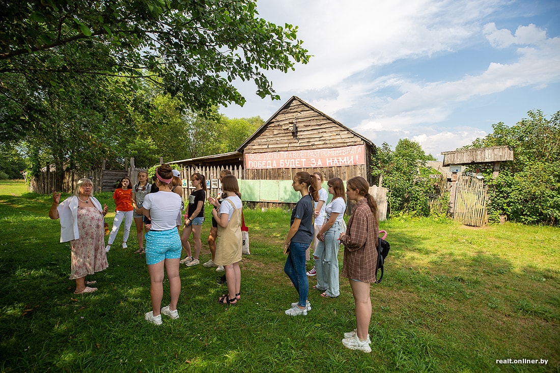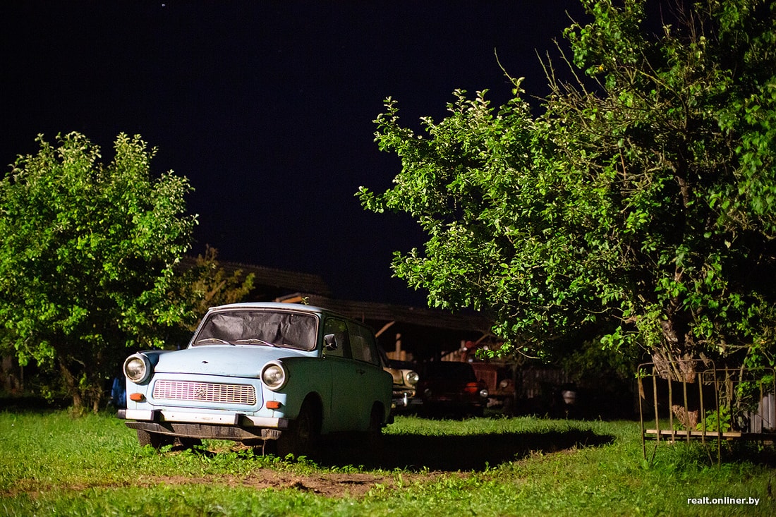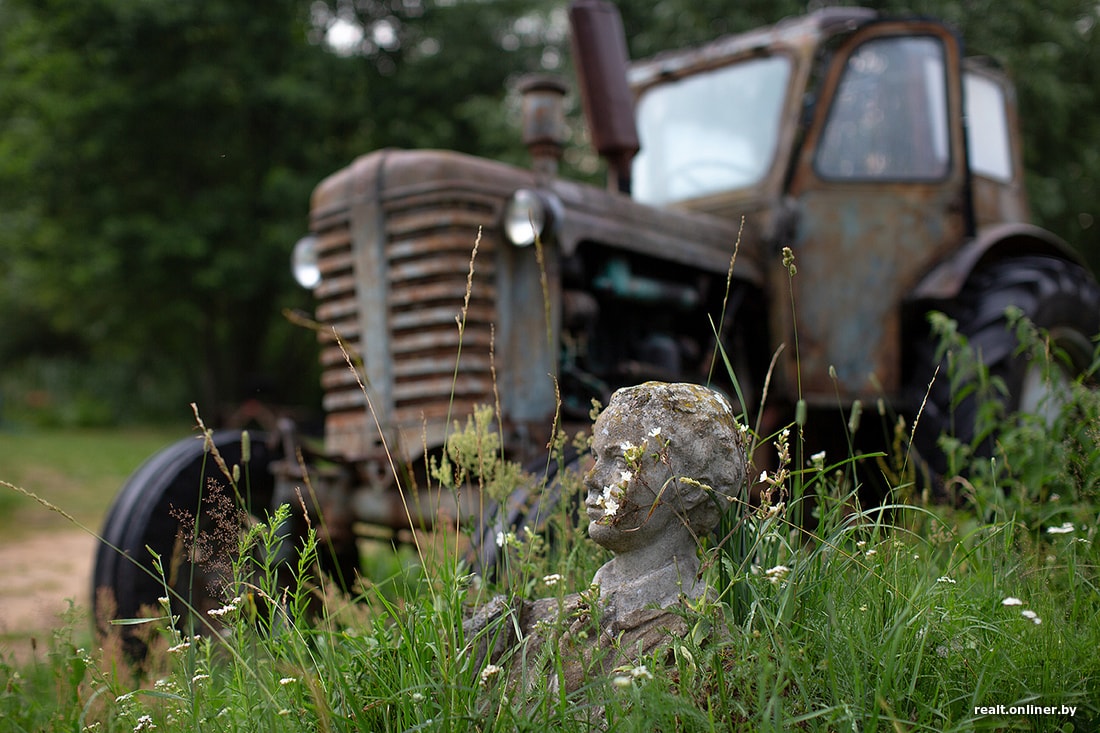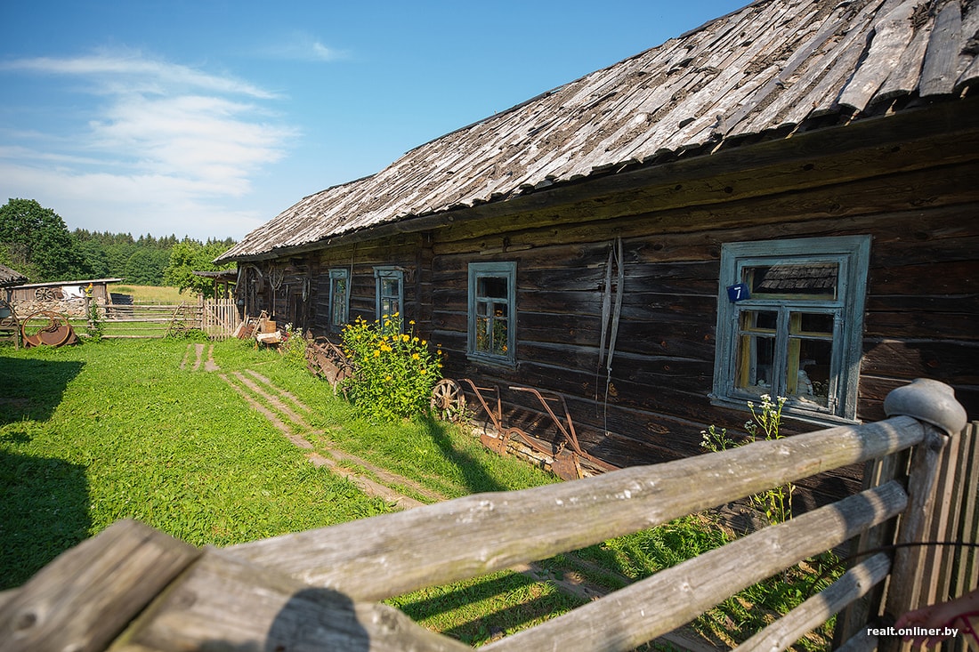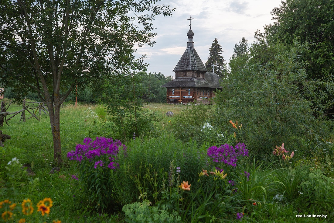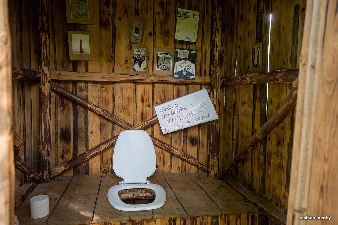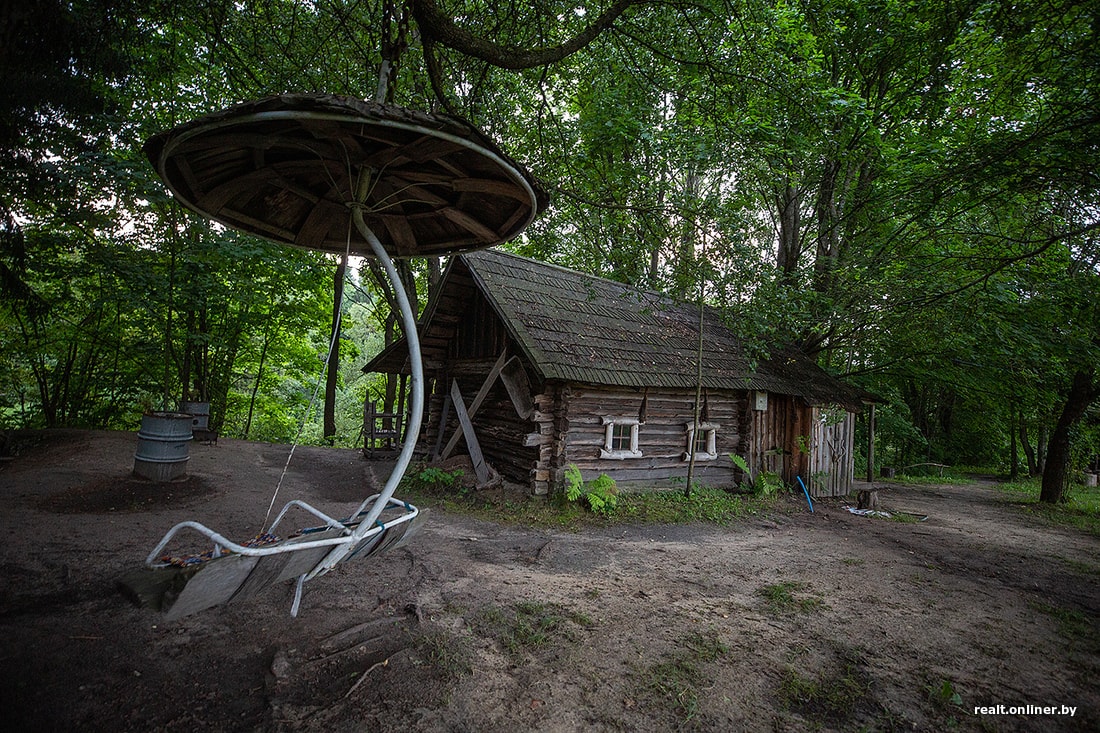 Усадьба находится на краю села. Там мы издалека заметили девушку с огненно-рыжей головой — это была Екатерина, одна из хозяев. Она провела нас к деревянному домику, как будто материализовавшемуся из какой-то белорусской сказки. На первом этаже — баня, в которой в молчаливом противостоянии столкнулись прошлое и настоящее (самовар и кофемашина), и большая терраса по периметру. На ней расположились два обеденных стола с массивными скамьями по бокам, гамак, продолговатый диван, несколько кресел и куча всяких ретро- и не очень вещей — от портрета Ленина и потрепанных жизнью радиоприемников до черепов животных и детских кукол. С одной стороны был спуск к высыхающему пруду, на котором одиноко торчал небольшой плот, поросший травой. Именно на нем мы и хотели покататься. Хозяйка даже предложила накрыть там ужин. Правда, гроза помешала этим планам. Но мы и не особо расстроились: прогулка по «большой луже» не обещала быть сильно увлекательной.