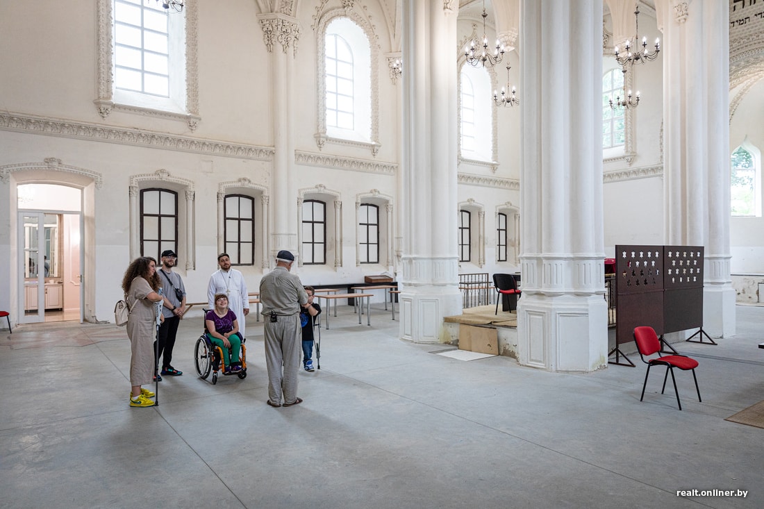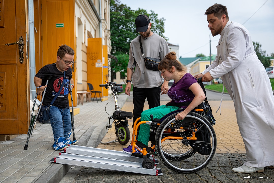 Продолжая городскую экскурсию, отправляемся в синагогу. В какой-то момент Анна решает, что передвигаться по тротуару ей будет удобнее без «электроприставки». Агрегат отсоединяется и перемещается в руки Александра. Еще один довод в пользу инклюзивной команды: там, где не справится один, другой даже не заметит проблемы.