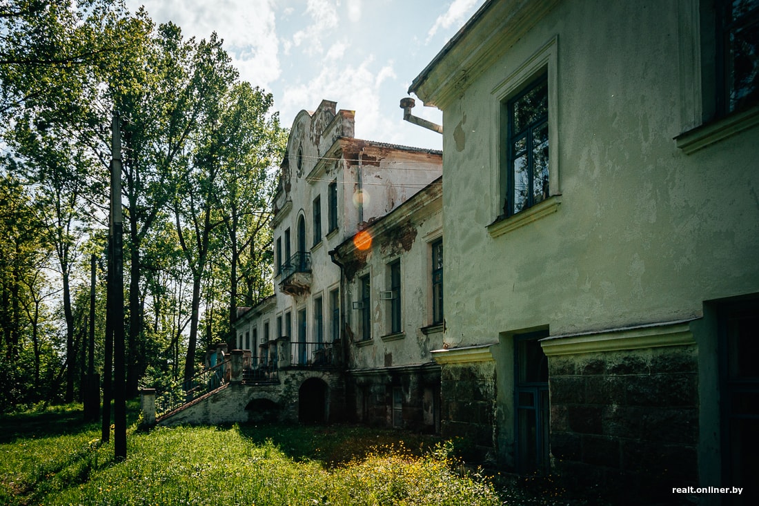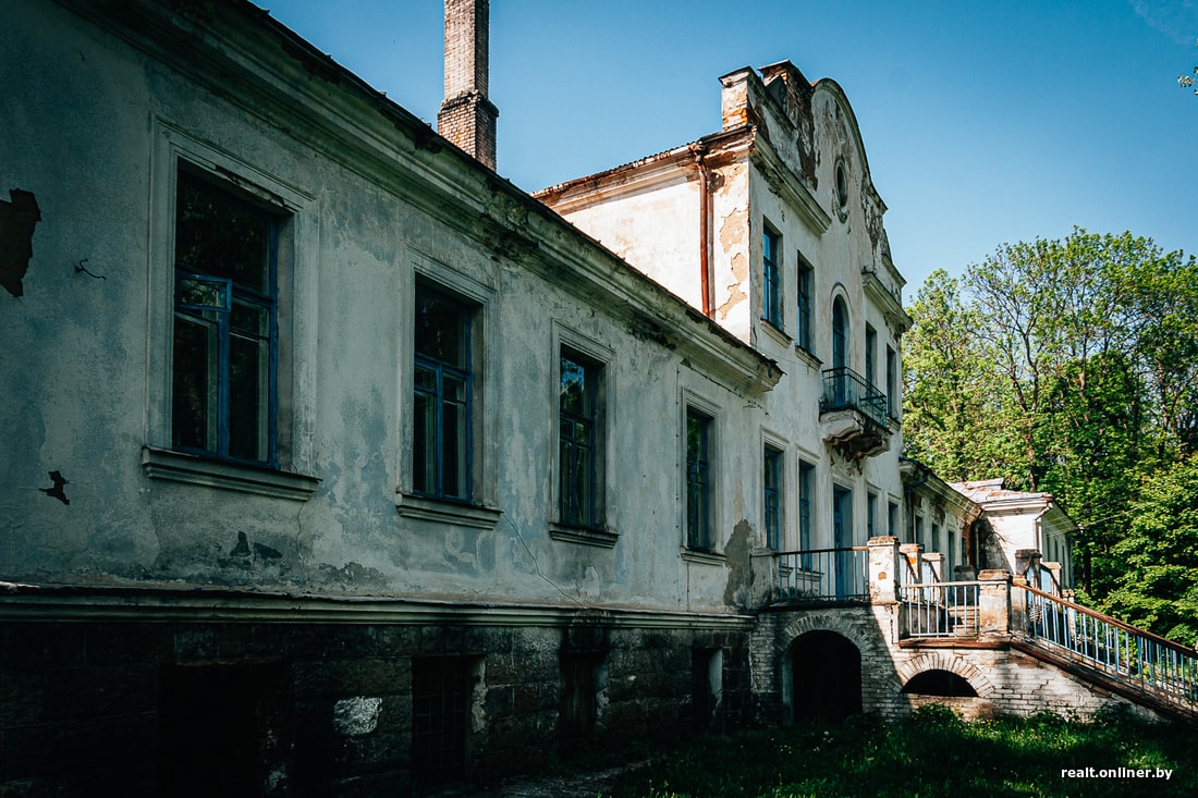 Усадьба сгорела во время Второй мировой, но, к счастью, после войны ее не стали сносить, а, как могли, восстановили и приспособили под санаторий. В главном доме и соседних зданиях разместились санаторные корпуса. Примерно тогда же в парке появился типичный декор послевоенного времени: скульптуры зубра и оленя, типовая фигура матери с ребенком на плече, этакая социалистическая Мадонна. Завершили украшение старого шляхетского парка установкой Ленина прямо перед прежним панским домом.