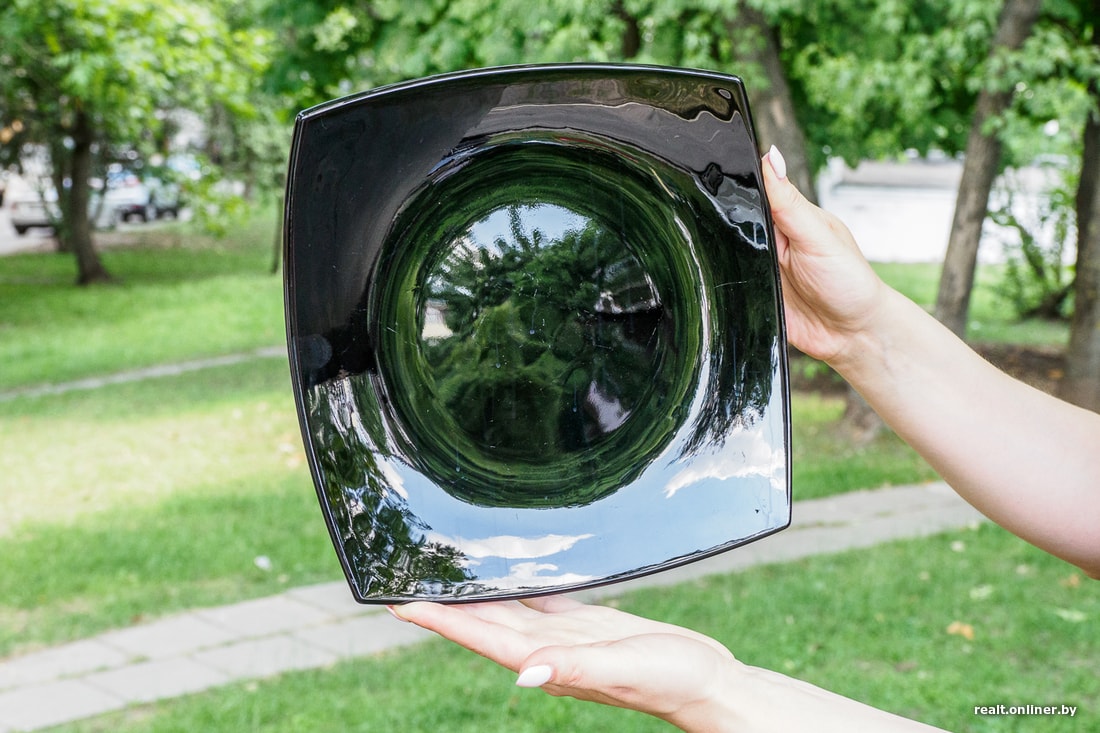 Бокалы почти хороши: есть небольшие разводы, но по сравнению с остальными случаями их надо выискивать. Сковорода чистая, красивая. Черная тарелка, увы, не без греха — пару потеков таки нашлось. А вот приборы (за исключением одного ножа) выглядят отлично.