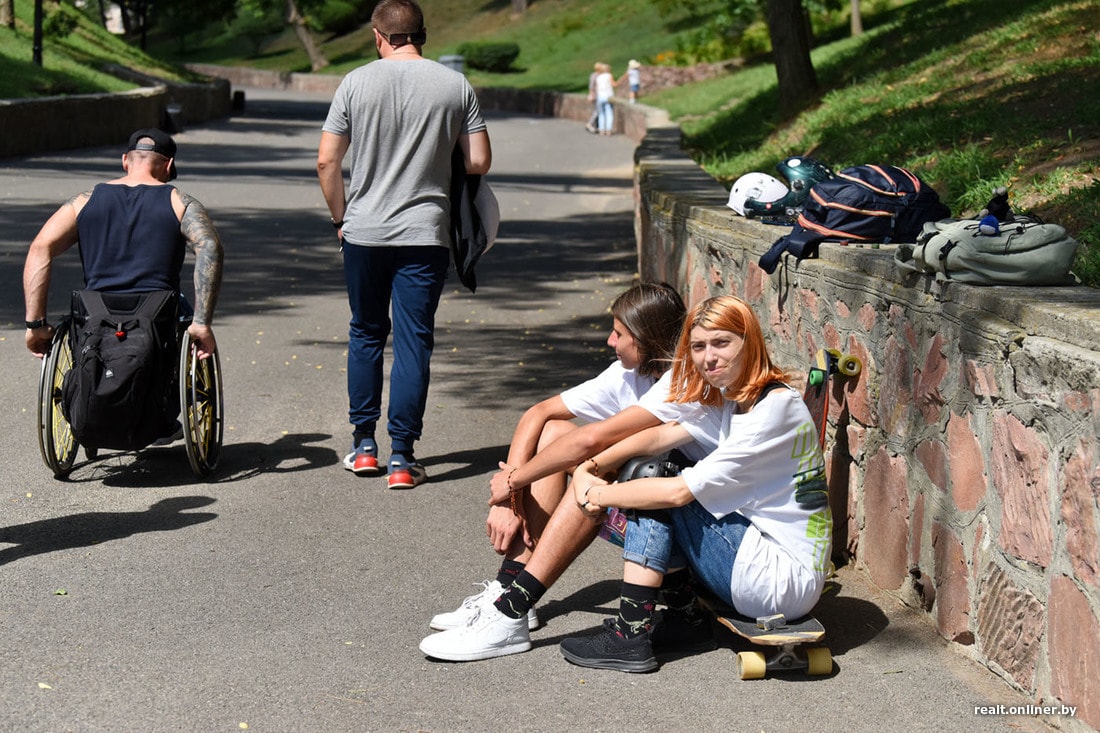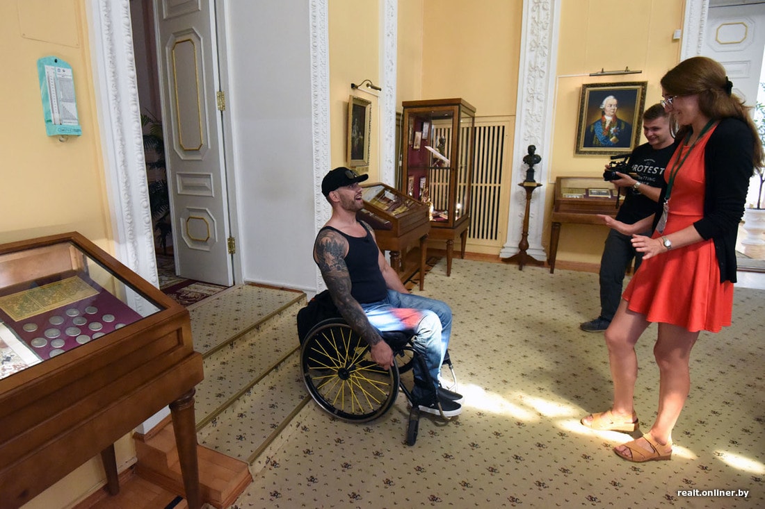 — Передние проходят, а задние нет, лучше расширить, — осторожничает Виктор. Почему нет привычного нашему взгляду пандуса? Дело в том, что дворец относится к историко-культурным учреждениям, а оттого и пандусы тут запрещены. Под команду Бонд «На старт! Внимание! Марш!» Виктор берет рубеж Паскевичей, правда, с небольшим толчком. Внутри ребята рассматривают картины, но одним искусством сыт не будешь — на обед заезжают в местную пиццерию, оценивая пешеходные дороги на инклюзивность. Вроде неплохо. Тут кто-то предлагает скататься в Наровлю, начиная со слов: «Тут рядом турслет проходит...» Предложение поддерживается единогласно, несмотря на то, что ничего не рядом, от Гомеля 3—4 часа пути. От этого еще веселее.