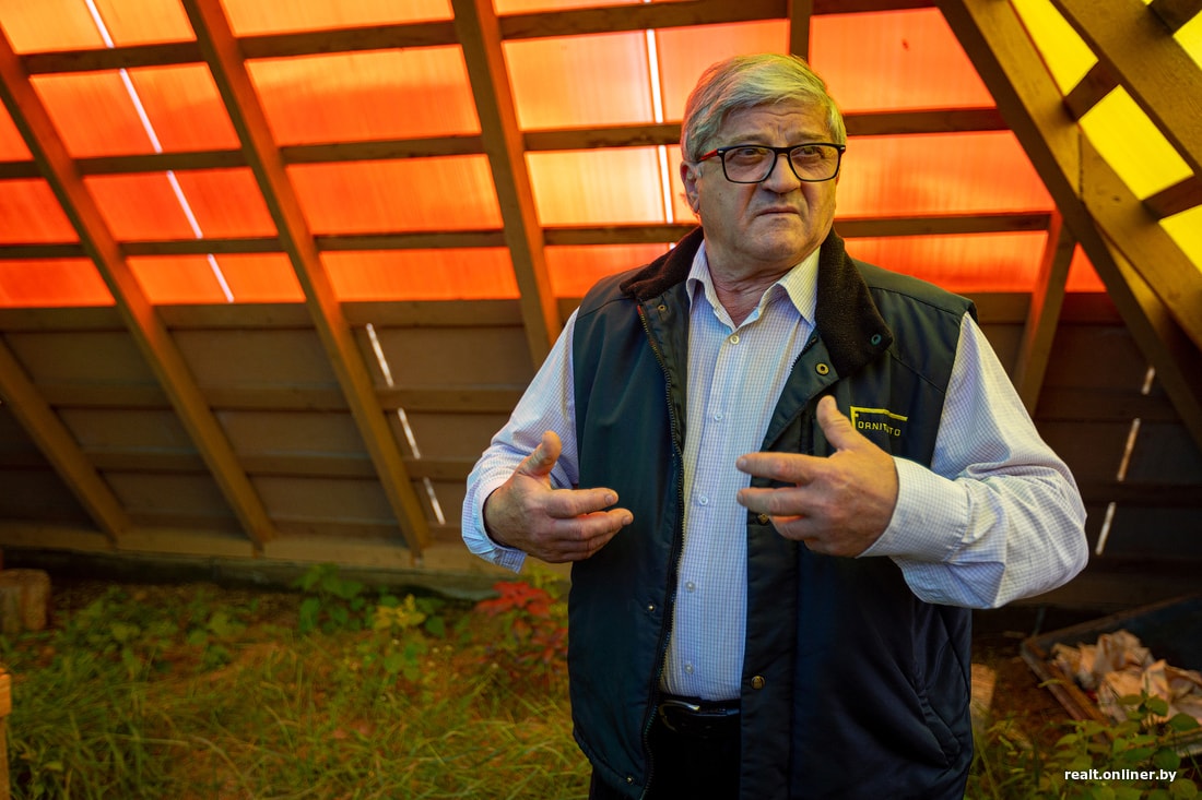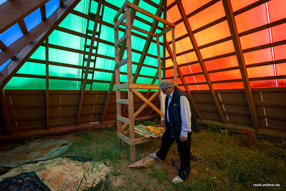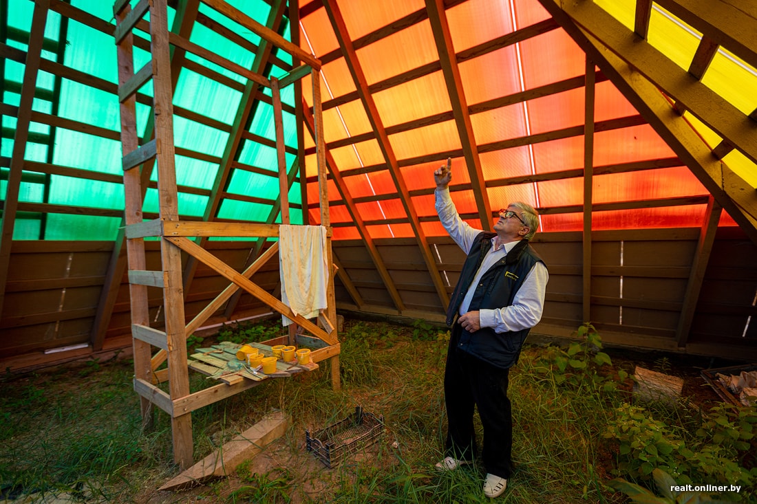 В прошлом году на участке Афанасия Саввича появилась еще одна крайне необычная постройка — пирамида высотой в несколько метров из поликарбоната. Ее создатель говорит, что при возведении соблюдал пропорции золотого сечения. Это еще один эксперимент, но другого толка.