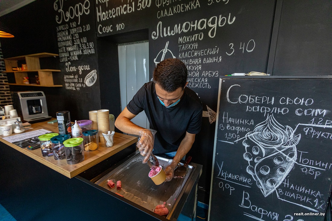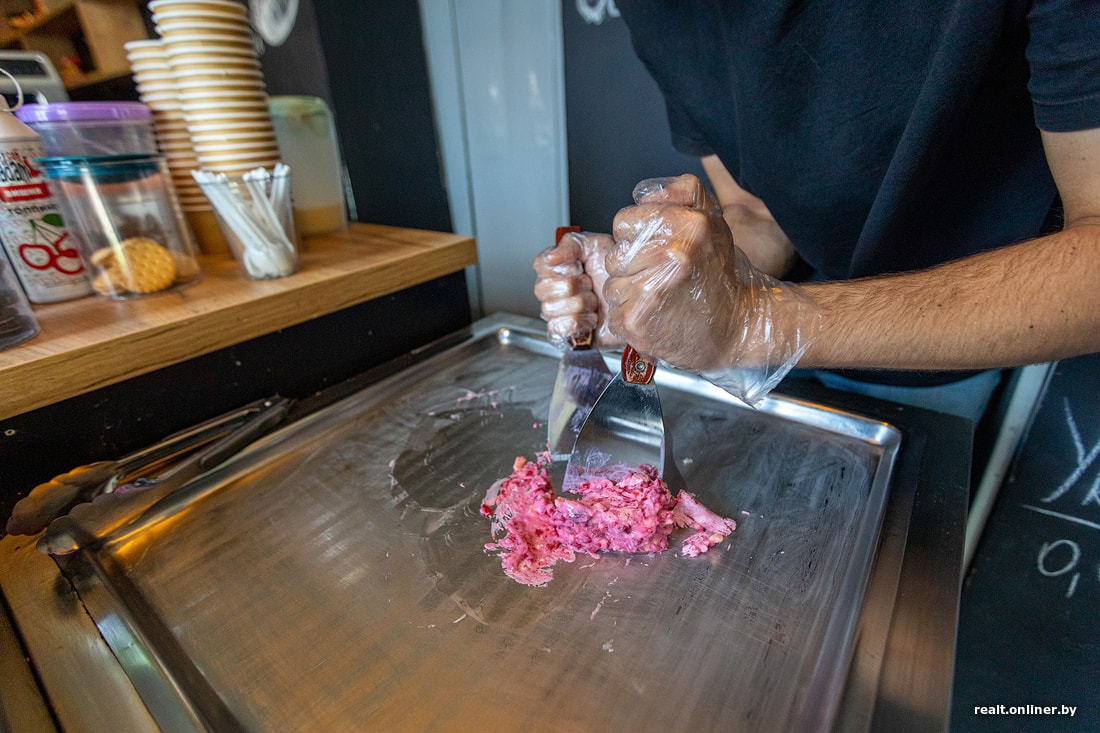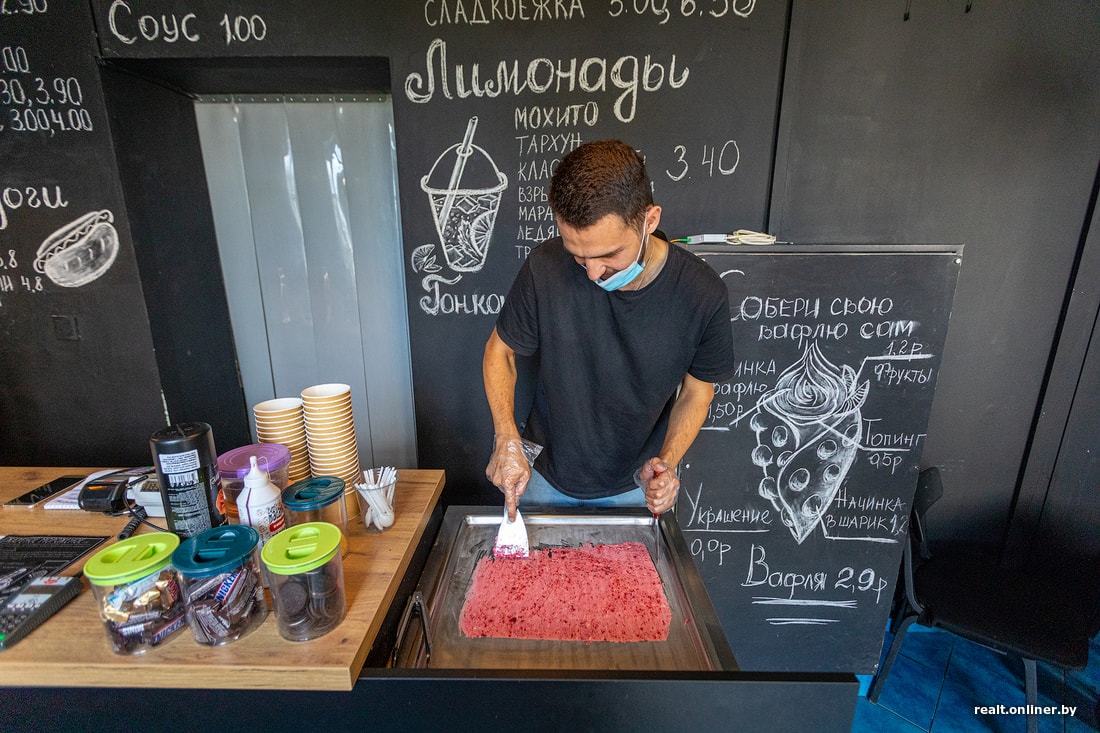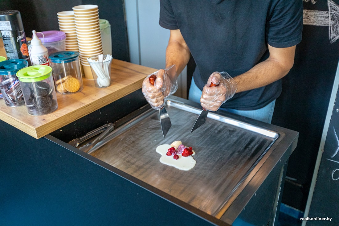 — Я привез эту идею из Таиланда, где был на отдыхе. Там стоял мужчина и лопатками быстро-быстро готовил мороженое из экзотических фруктов. Мне понравилось. Я попробовал, расспросил тайцев — они разрешили мне приготовить одну порцию самому. Я вернулся домой, начал изучать вопрос, искать оборудование и решил рискнуть.