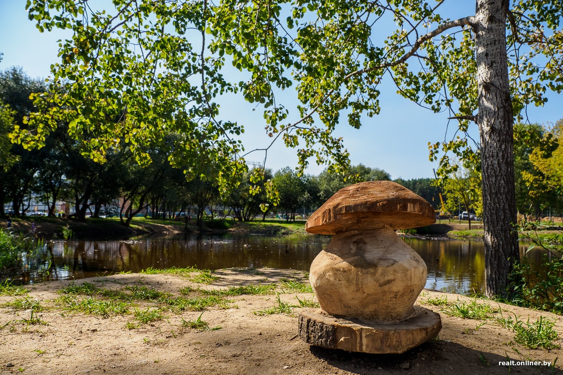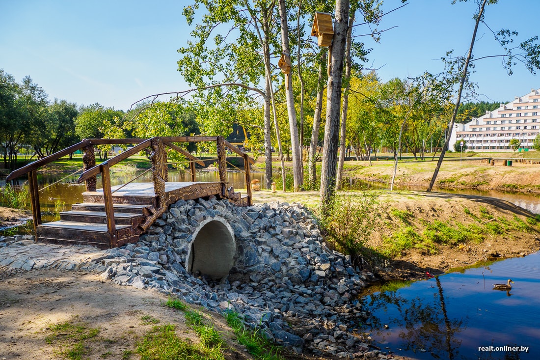 Симпатичный мостик, извилистые дорожки, детская площадка, арт-объекты — «Утиный берег» выглядит ухоженным и приятным (особенно в лучах золотого солнышка). Однако еще полгода назад здесь все выглядело иначе. Водоем был сильно заросшим, а территория вокруг — неокультуренной. Сейчас же все кардинально изменилось.