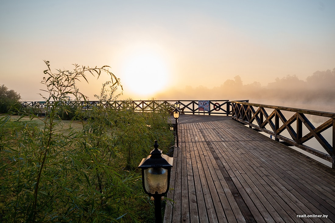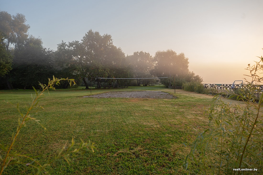 Ну а самое красивое место на острове, пожалуй, набережная. На причале можно поваляться в шезлонге или покататься на качелях, параллельно наслаждаясь завораживающим видом на Припять. А для активных людей на газоне установили батут и повесили волейбольную сетку.
