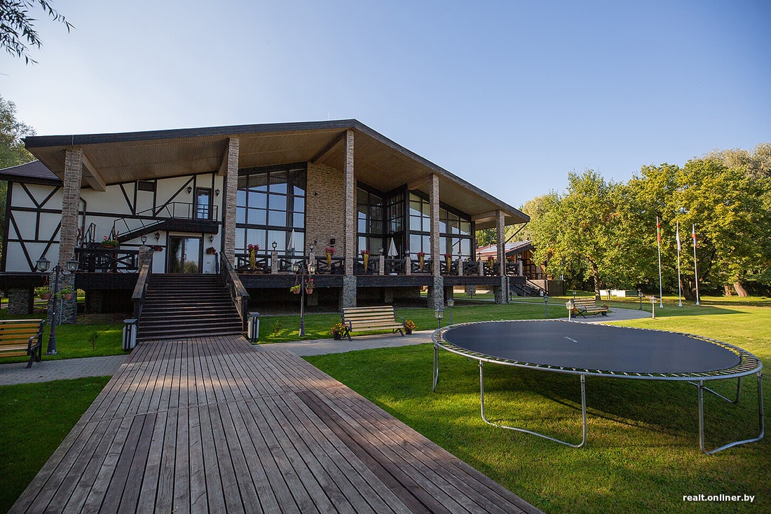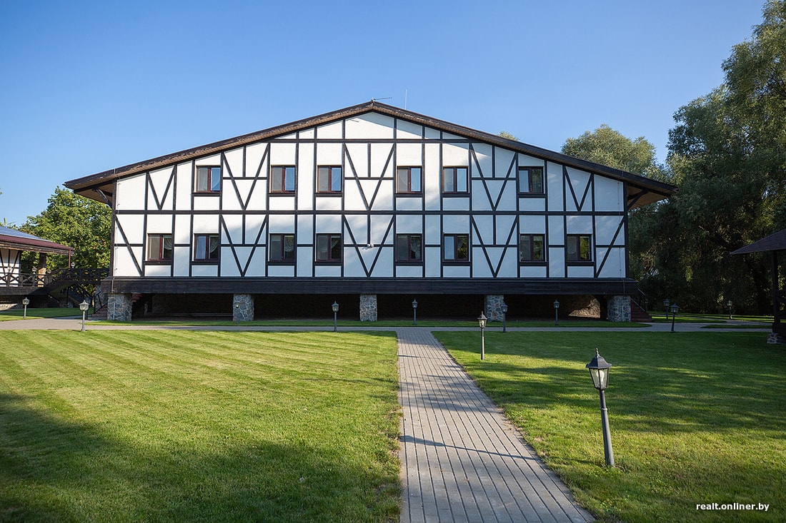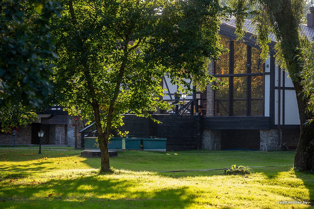 Здание напоминало более современную версию фахверков — с панорамными окнами, обилием стекла и камня. Рядом — пристройка (судя по всему, баня с купелью). Выглядело все симпатично.
