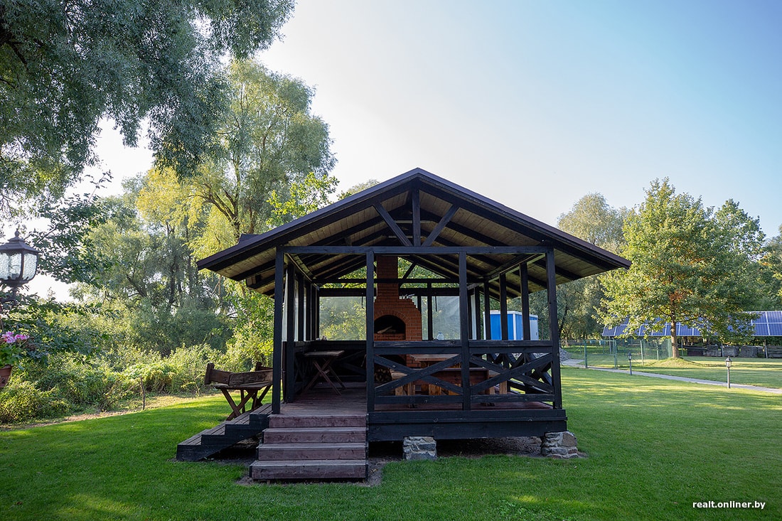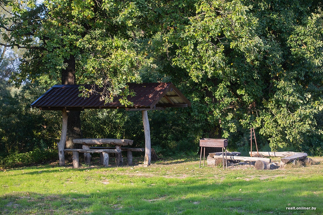 По всему участку хозяева щедрой рукой рассыпали несколько беседок с кострищами, а еще поставили летнюю кухню с кирпичной печью, умывальником и вместительным обеденным столом. На сайте сказано, что их аренда на 4 часа вместе с мангалом, шампурами и решеткой стоит 10 рублей.