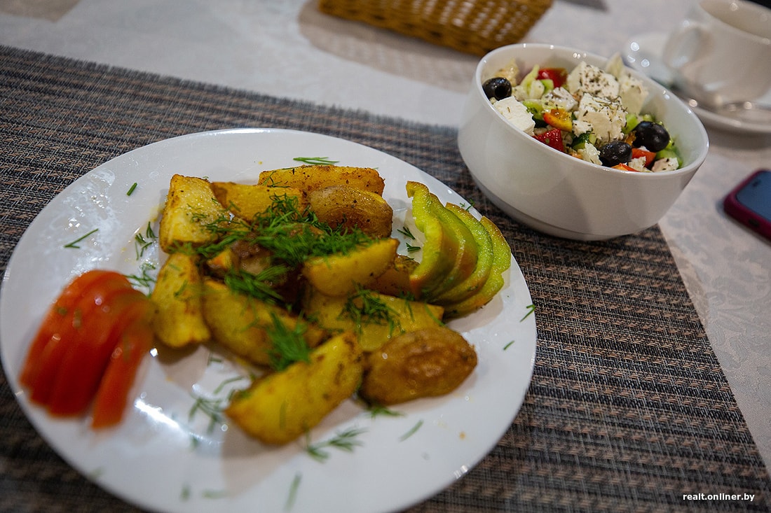 На базу мы вернулись после заката. Решили поужинать, поэтому направились к барной стойке, чтобы нажать кнопку вызова персонала. Так как бармен/официант/повар по-библейски соединились здесь в одном лице, пришлось немного подождать, нервно перелистывая меню. Через несколько минут к нам подплыла русоволосая женщина в синем фартуке и приняла заказ. Выбор блюд в целом неплохой, такая классическая домашняя кухня с рыбным уклоном, если не считать того, что некоторые позиции приготовить нам почему-то не смогли. По итогу тайный гость остановился на курином филе в сыре за 6 рублей и картофельных ломтиках с овощами за 6 рублей, а коллега-фотограф — на все тех же ломтиках и греческом салате за 7 рублей. Чай обошелся в 2 рубля, кофе — в 3,5. Еду принесли минут через 15. Порции были приличных размеров, да и вкус не разочаровал. Еще и за такие деньги.