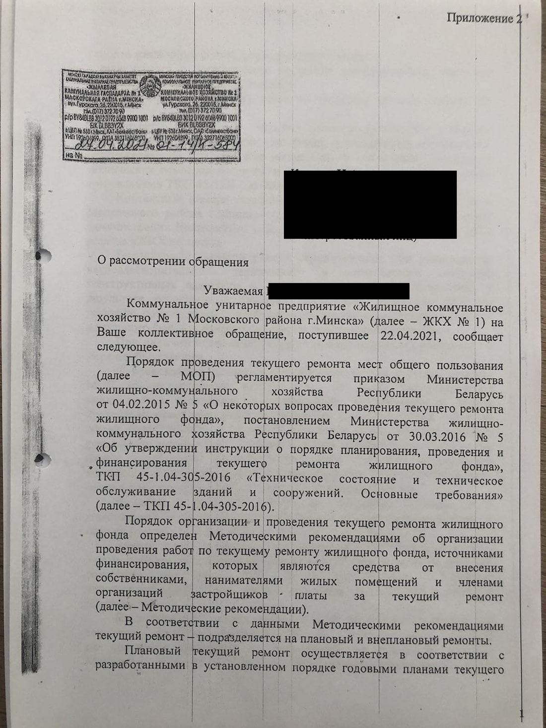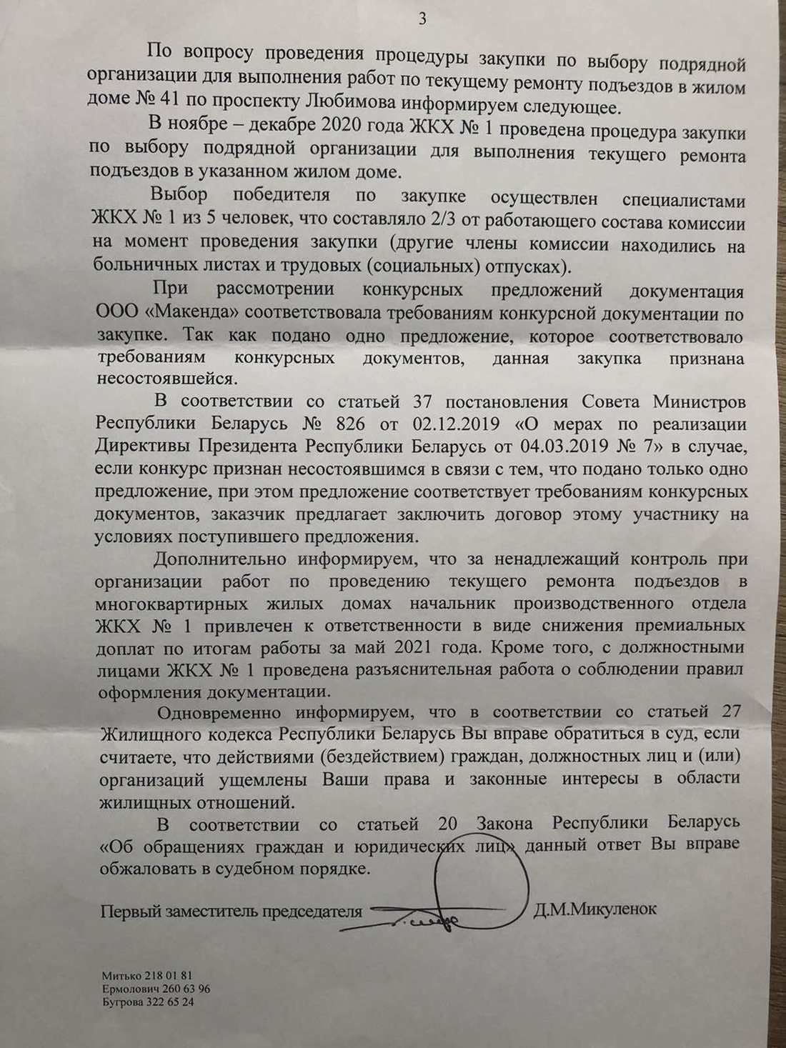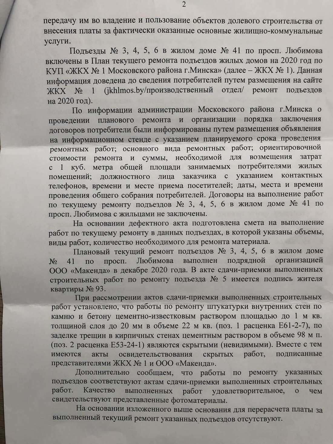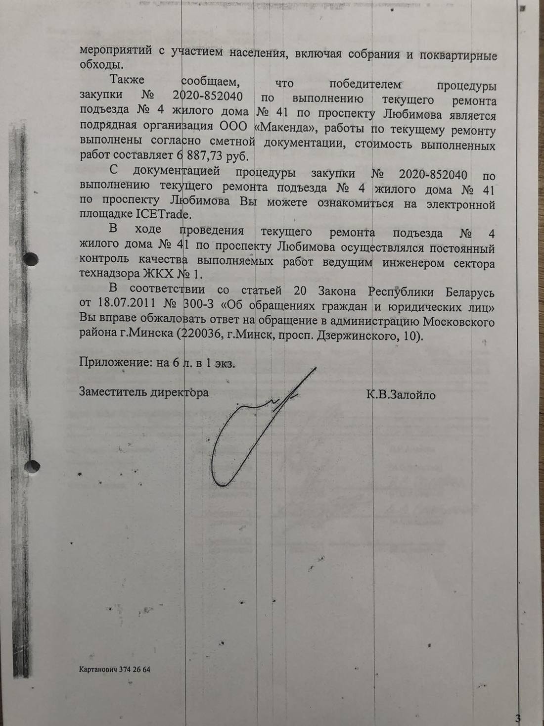 — Ремонт подъездов выполнен согласно законодательству Республики Беларусь и методическим рекомендациям Постановления №5 Министерства жилищно-коммунального хозяйства, — отметили в ЖКХ. — С жильцами неоднократно проводились собрания. Два раза после выполненного ремонта, где присутствовала подрядная организация. Текущий ремонт выполнен на основании процедуры закупок (тендера). Подрядчик выполнил работы в соответствии со сметной документацией. Реестр начислений жильцам выставлен согласно выполненным работам, и в актах выполненных работ имеются подписи третьего, четвертого, пятого и шестого подъездов (в редакции этих документов нет. — Прим. Onlíner).