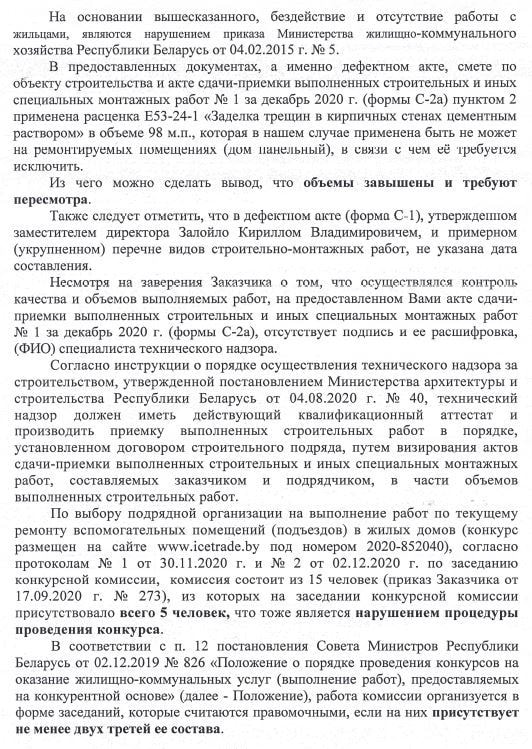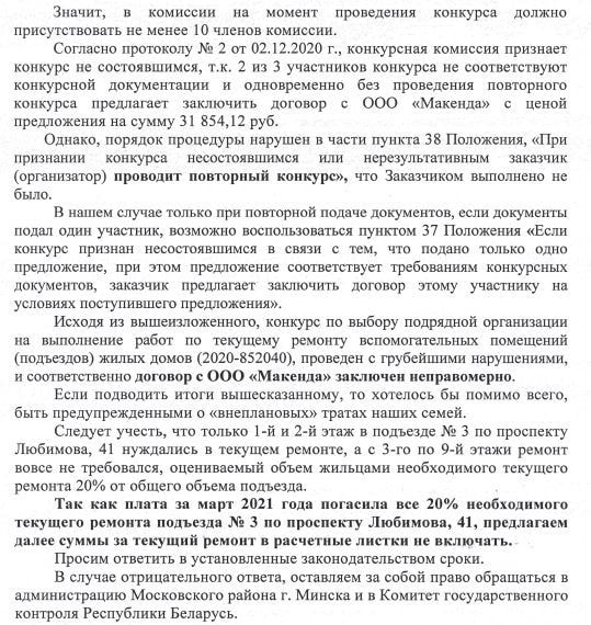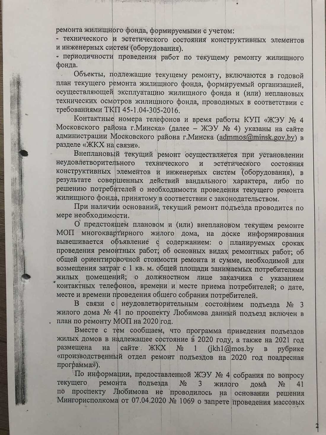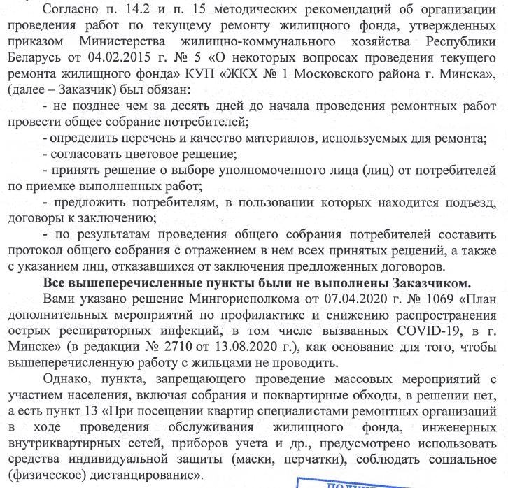 Помимо всего, в ЖКХ есть годовой план по выполнению определенных объемов строительно-монтажных работ, по которому они отчитываются перед администрацией Московского района, а администрация в свою очередь, стремясь выполнить плановые показатели по вышеуказанным работам, отчитывается перед Мингорисполкомом, ведь за их невыполнение должностным лицам грозит депремирование. По мнению жителей подъездов, такая схема по выполнению планов строительно-монтажных работ является искусственно навязанной жильцам, а фактически требуемые работы по подъездам необходимы были в меньших объемах.