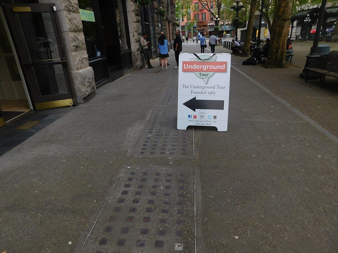 Однако интереснее другое обстоятельство. В рамках восстановления Сиэттла после пожара низина, в которой он прежде находился, была постепенно засыпана грунтом. Однако пока это происходило, прежние улицы, расположенные на уровне моря, продолжали существовать. Новые здания изначально строились с двумя парадными входами. Один находился внизу и выводил на «нижнюю» улицу. Постепенно на уровне второго этажа формировались параллельные «верхние» улицы. Когда они открывались для движения, второй этаж становился первым, а бывший первый превращался в подвал. В тротуарах наверху были оставлены заложенные стеклянными блоками окна, через которые ставшие «подземными» улицы продолжали освещаться.