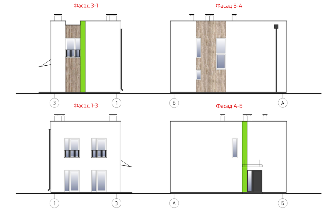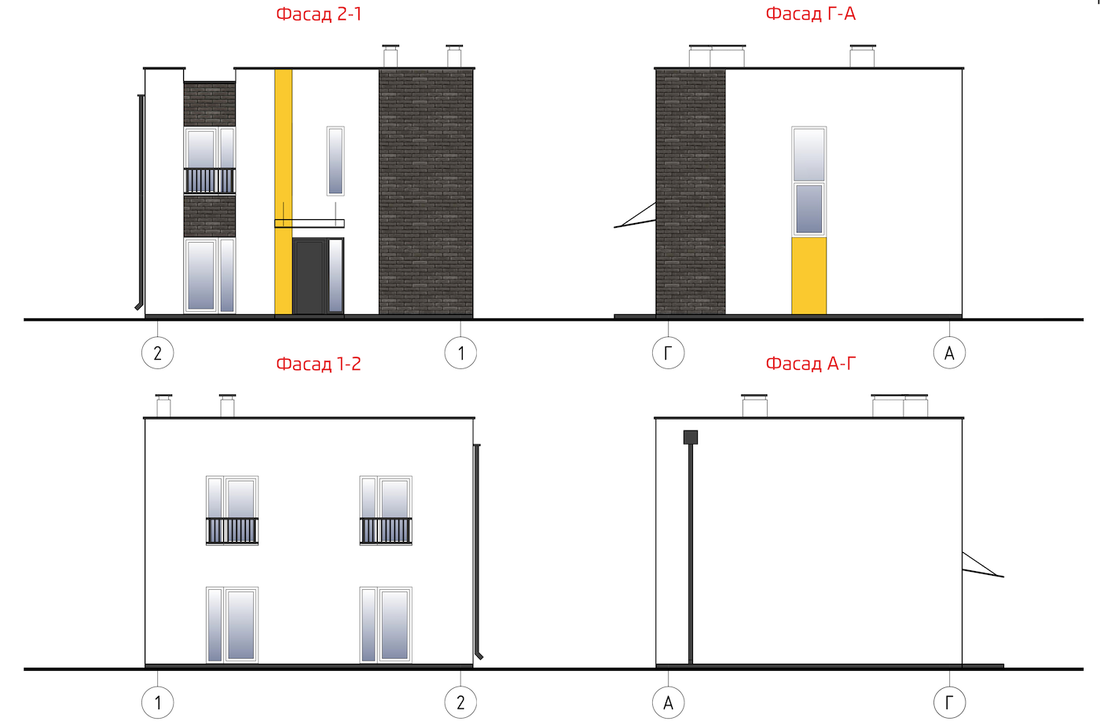 Дома двухэтажные с плоской кровлей. Фасады запроектированы в «современном минималистичном архитектурном стиле», наружная отделка соответствует «современным тенденциям и нормативным требованиям».