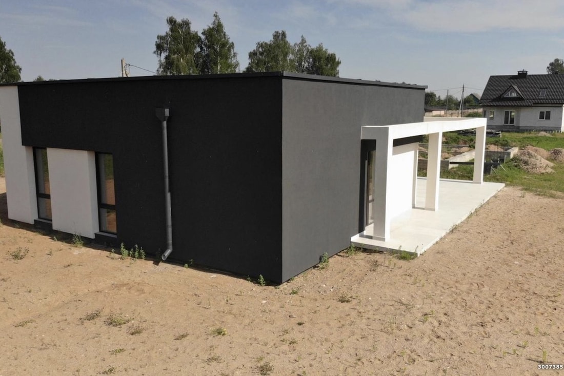Современный дом с плоской кровлей продается в деревне Курганье. Лаконичные формы, контрастные цвета фасада, большая терраса — в одном объекте собрано все, что сейчас так модно. Это как раз тот вариант, когда новому хозяину останется только выполнить отделку под себя и можно переезжать.